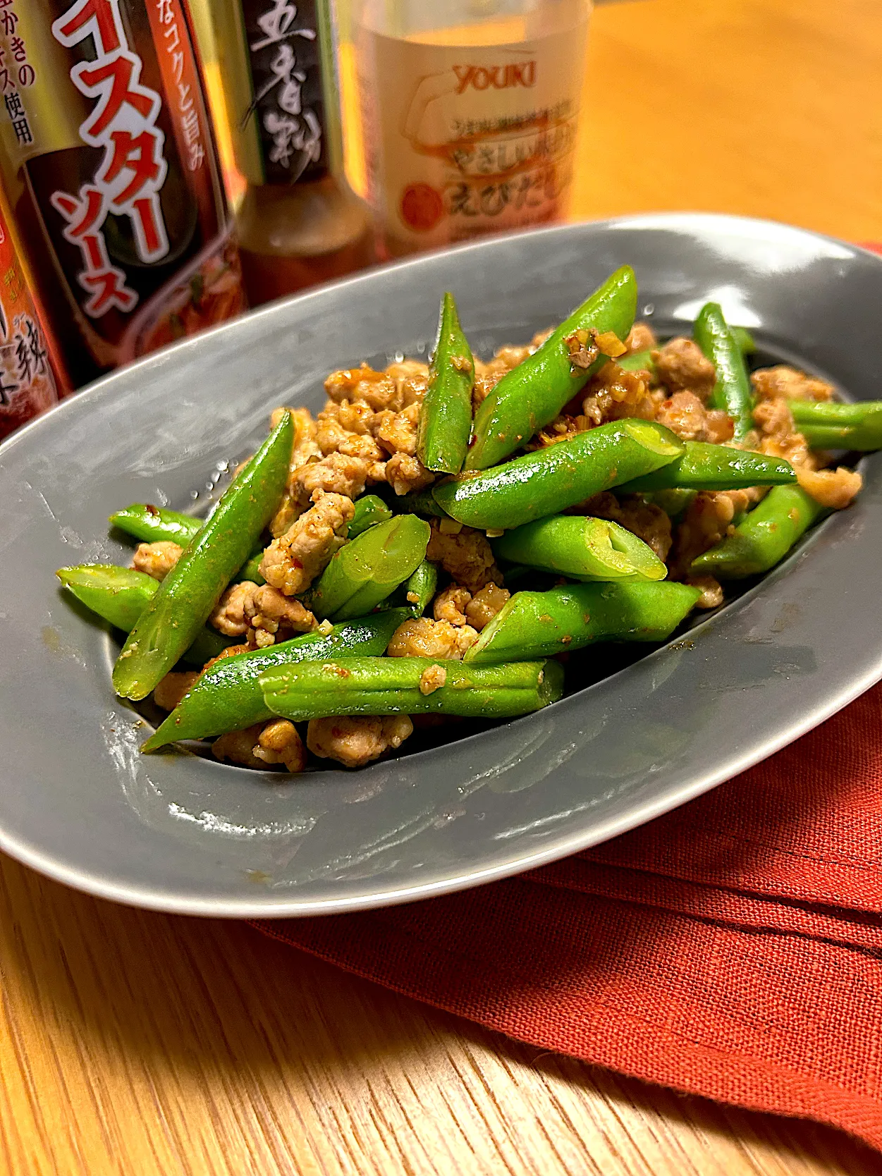 しゃきしゃき、ほんのり甘いいんげんと五香粉とえびだしとオイスターソースと、少し辛味が欲しくて麻辣醤と、にんにくのきいた豚粗挽き肉