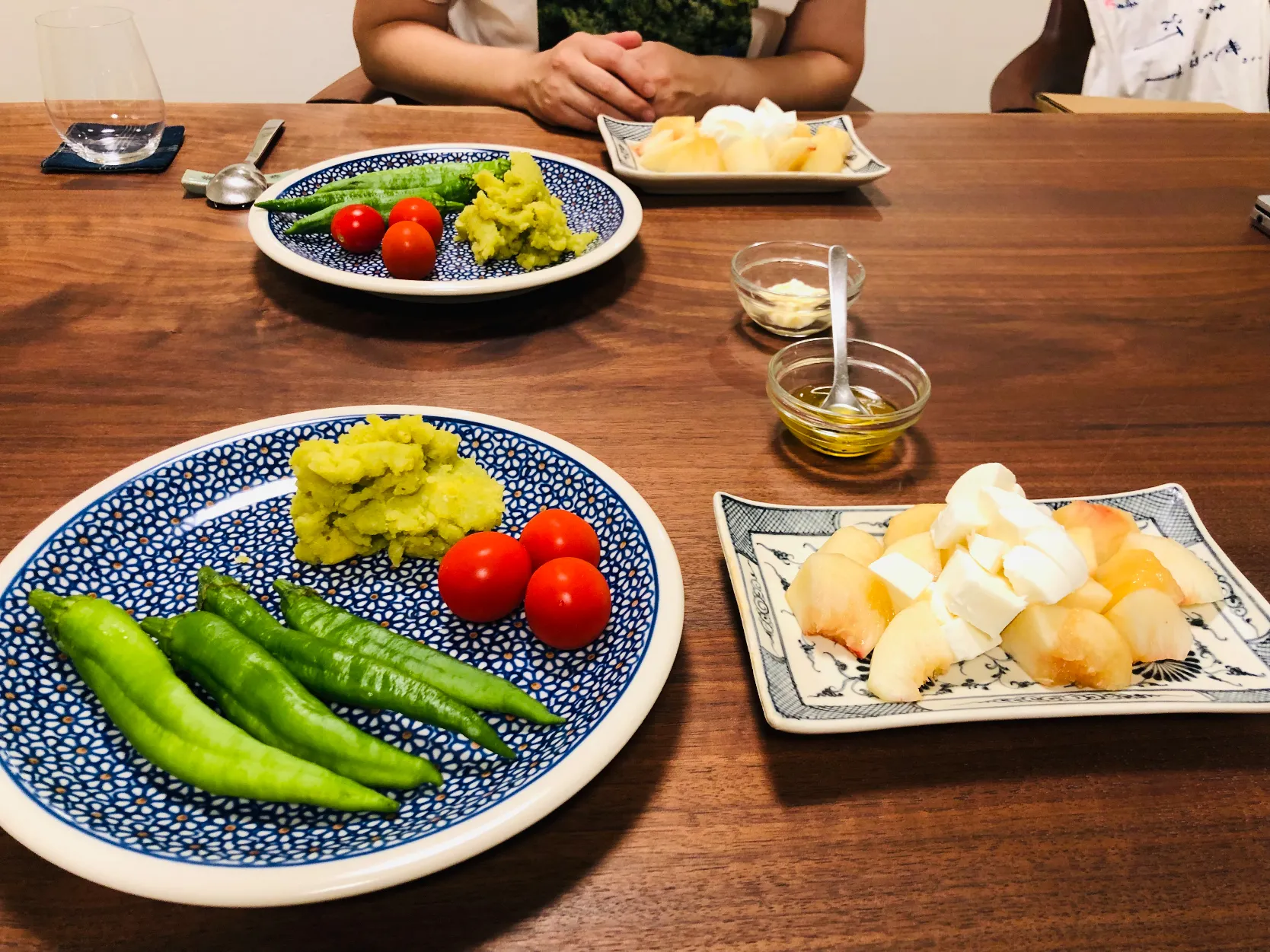 ピーじゃが、サラダ甘唐辛子、桃のカプレーゼ