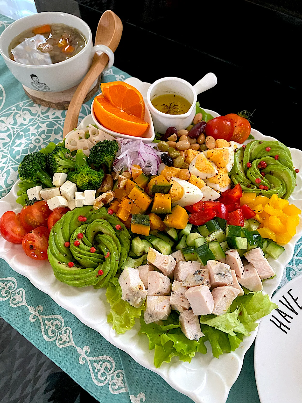 サラダ豆、胡桃、クリームチーズ、ゆで卵、紫玉ねぎ、アボカド、サラダチキン✨みかん