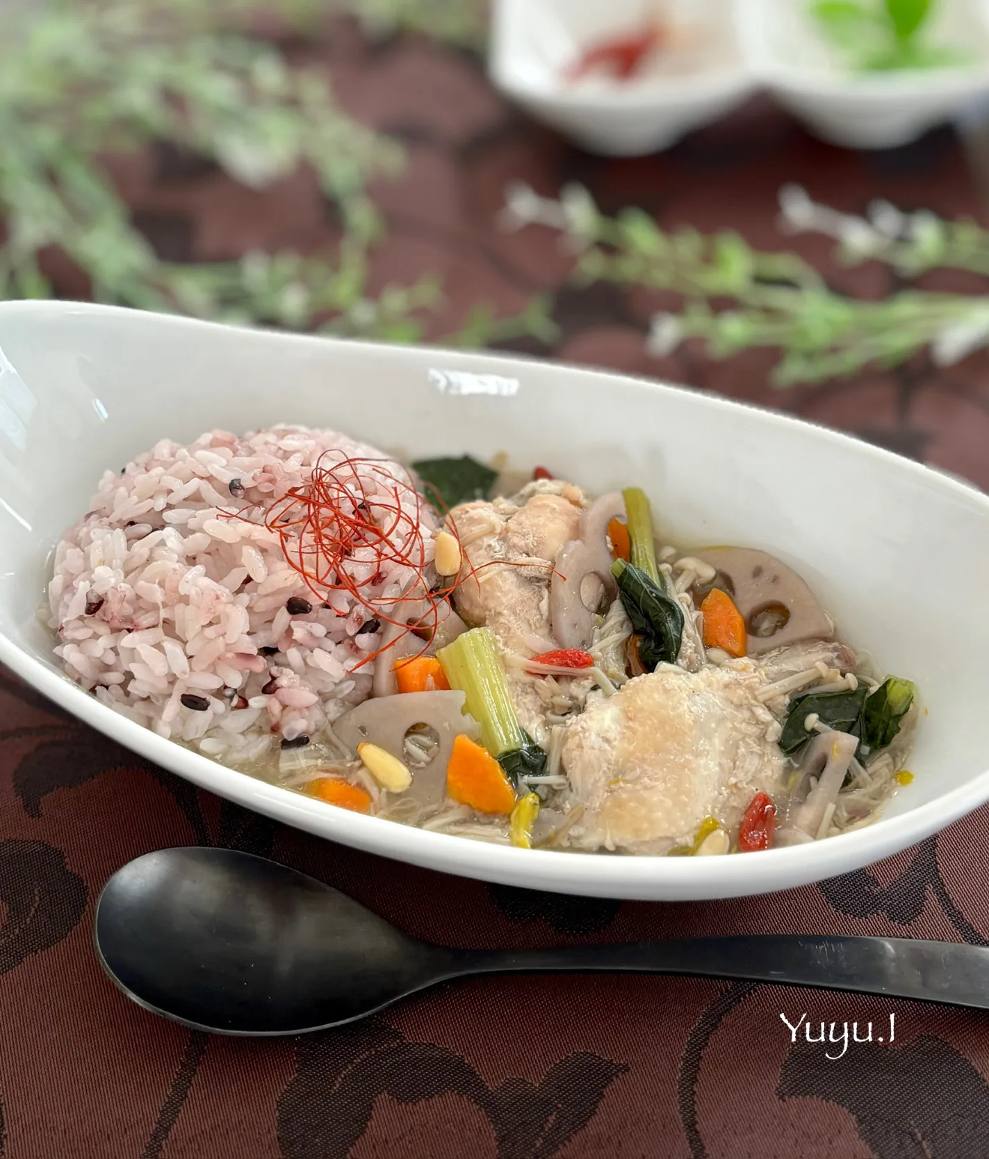 #スープご飯 #サムゲタン #手羽元 #れんこん #圧力鍋 #塩糀 #黒米