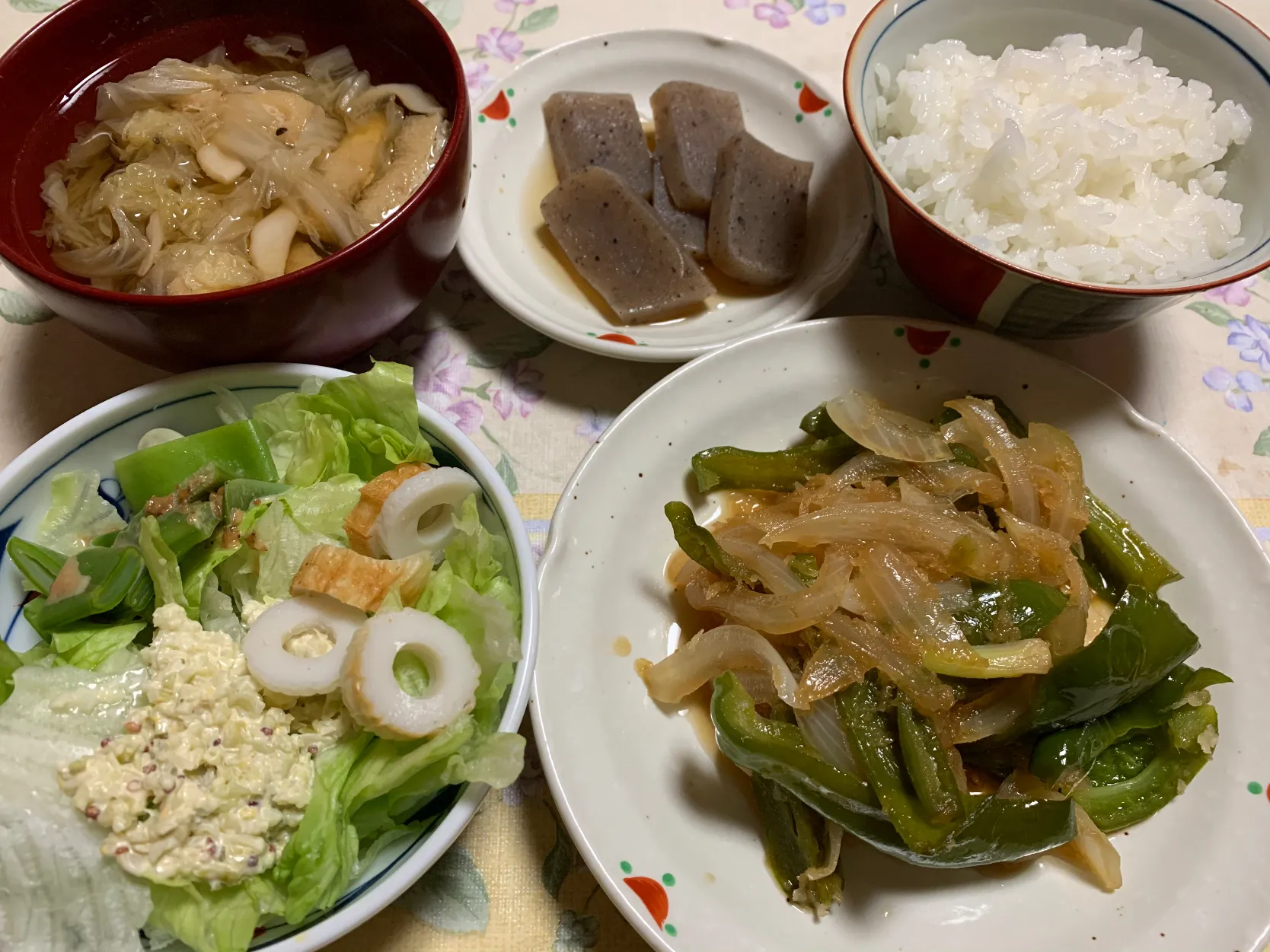 朝ごはん、ソーセージ生姜焼き、サラダ、こんにゃく