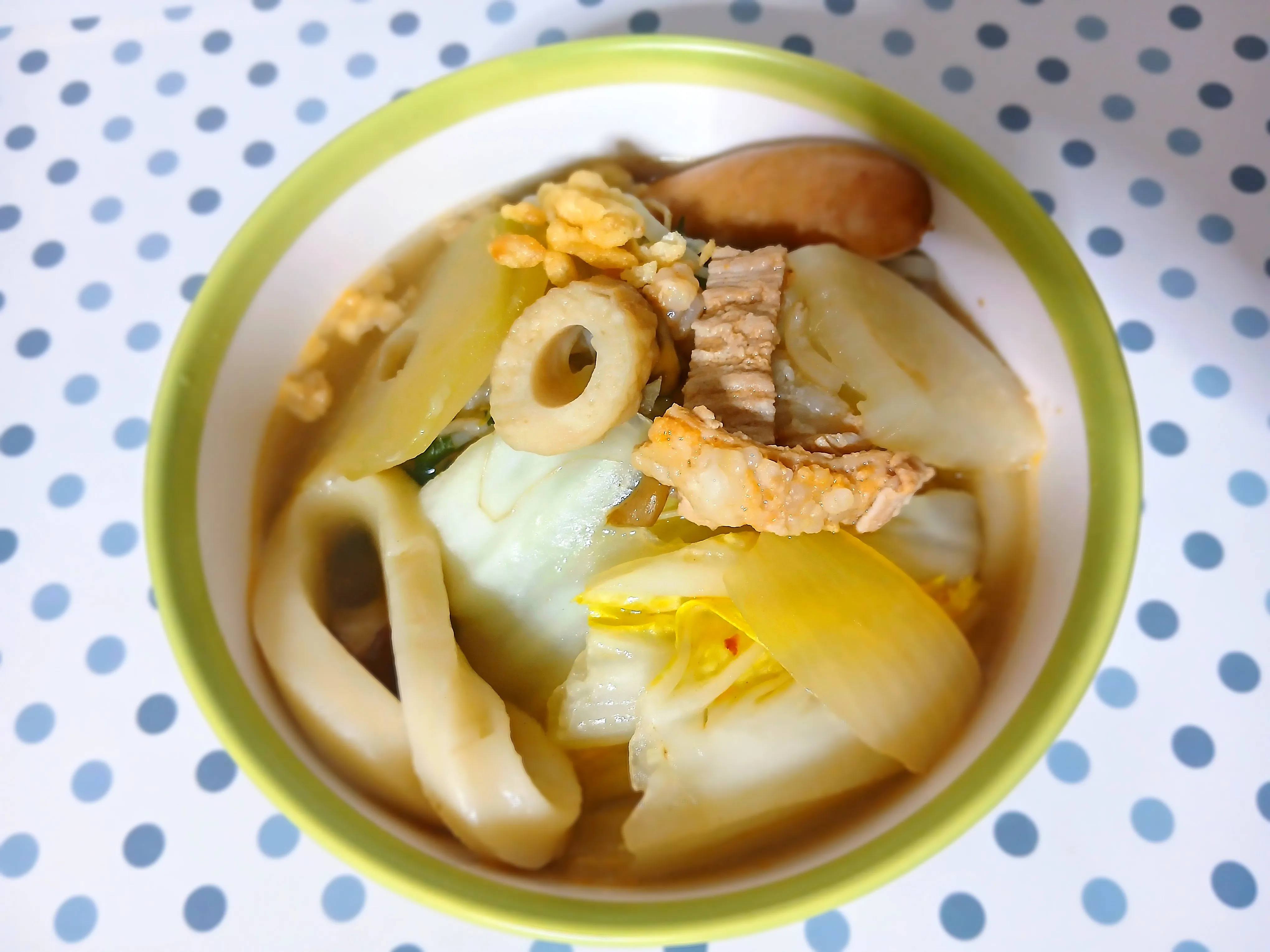 極太うどん(茹で麺),白菜,玉ねぎ,大根,青パパイヤ,もやし、株取りなめこ,ちくわ、ウィンナー,味付けホルモン,仕上げに天かす