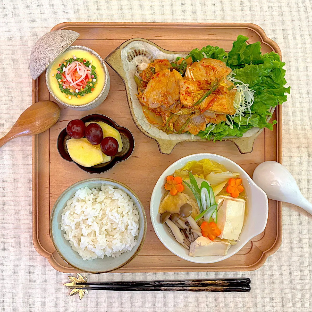 ・味噌漬けで豚キムチ炒め(フリルレタス、キャベツ、大葉)