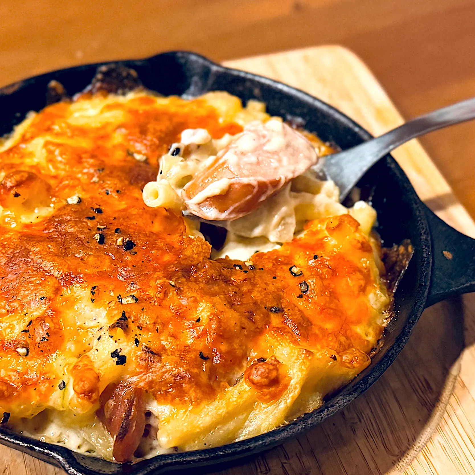 ありものでなんでもグラタンにしちゃいます #グラタン #マカロニ #ウインナー #ホワイトソース #スキレット