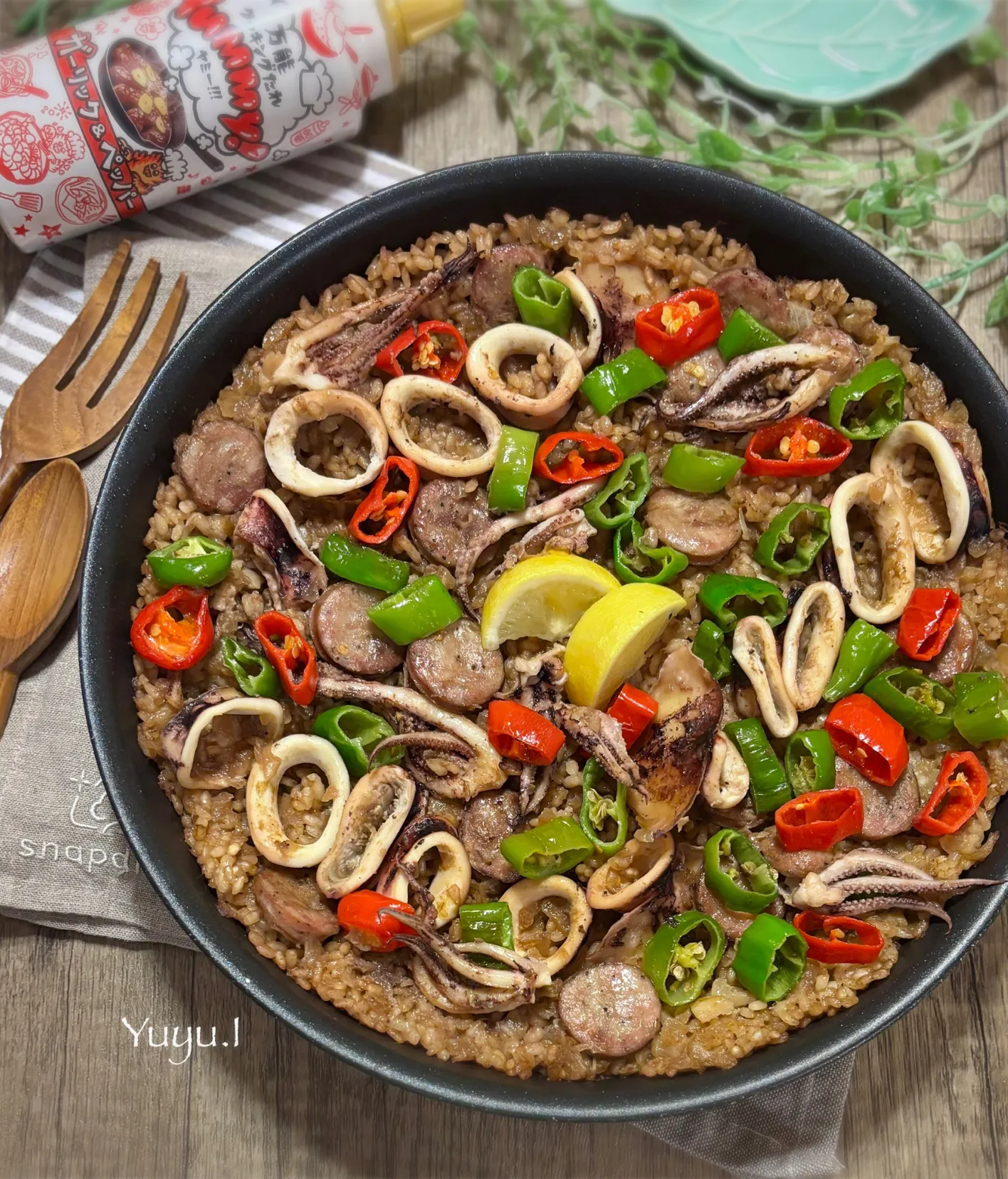 #パエリア #ご飯 #イカ #いか #ソーセージ #万願寺とうがらし #甘唐辛子 #甘とう #イカワタ #しょうゆ #醤油 #yummy