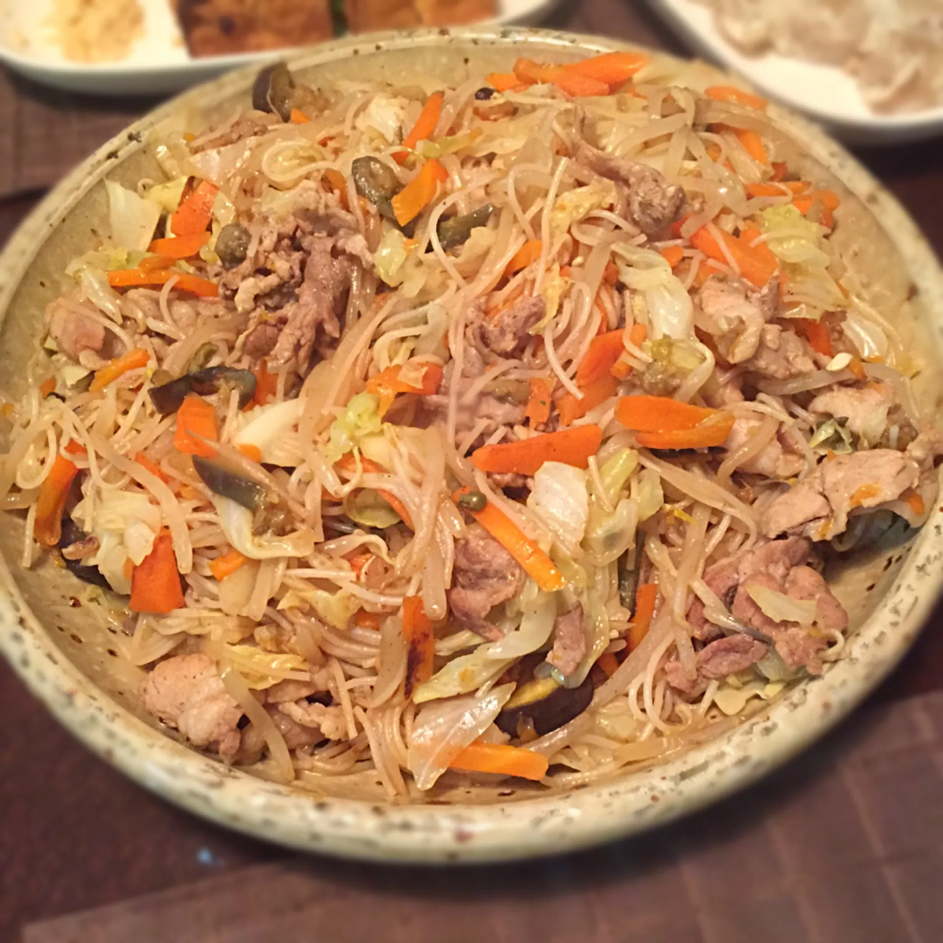 今日は一日家から出なかったので、買い置きのビーフンに冷蔵庫の野菜に肉で焼きビーフンてんこ盛り 笑 焼きそばよりあっさり✨美味しくいただいてます😋