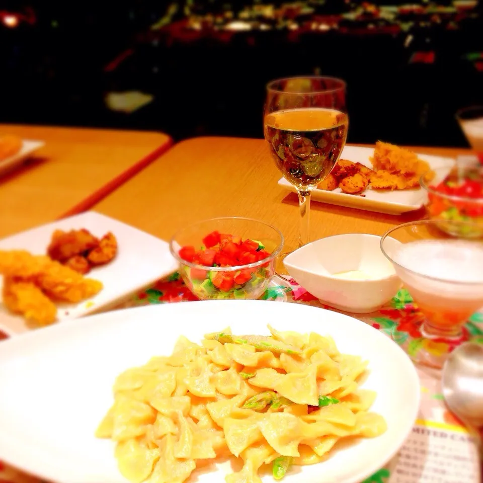 パスタ生地を、一つ一つリボン型に成型する地味な作業でしたが、白ワインが進む一品です(o^^o)