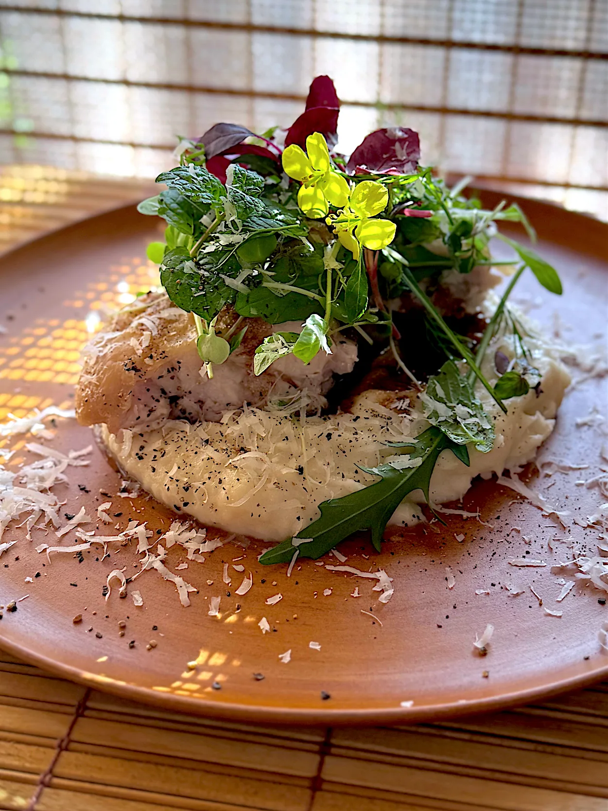#チキン #グリルチキン #ローストチキン #マッシュポテト #ハーブ #マイクロハーブ #ルッコラ #アマランサス #エディブルフラワー #家庭料理 #モダン料理 #モダンアメリカ料理 #松本かおる