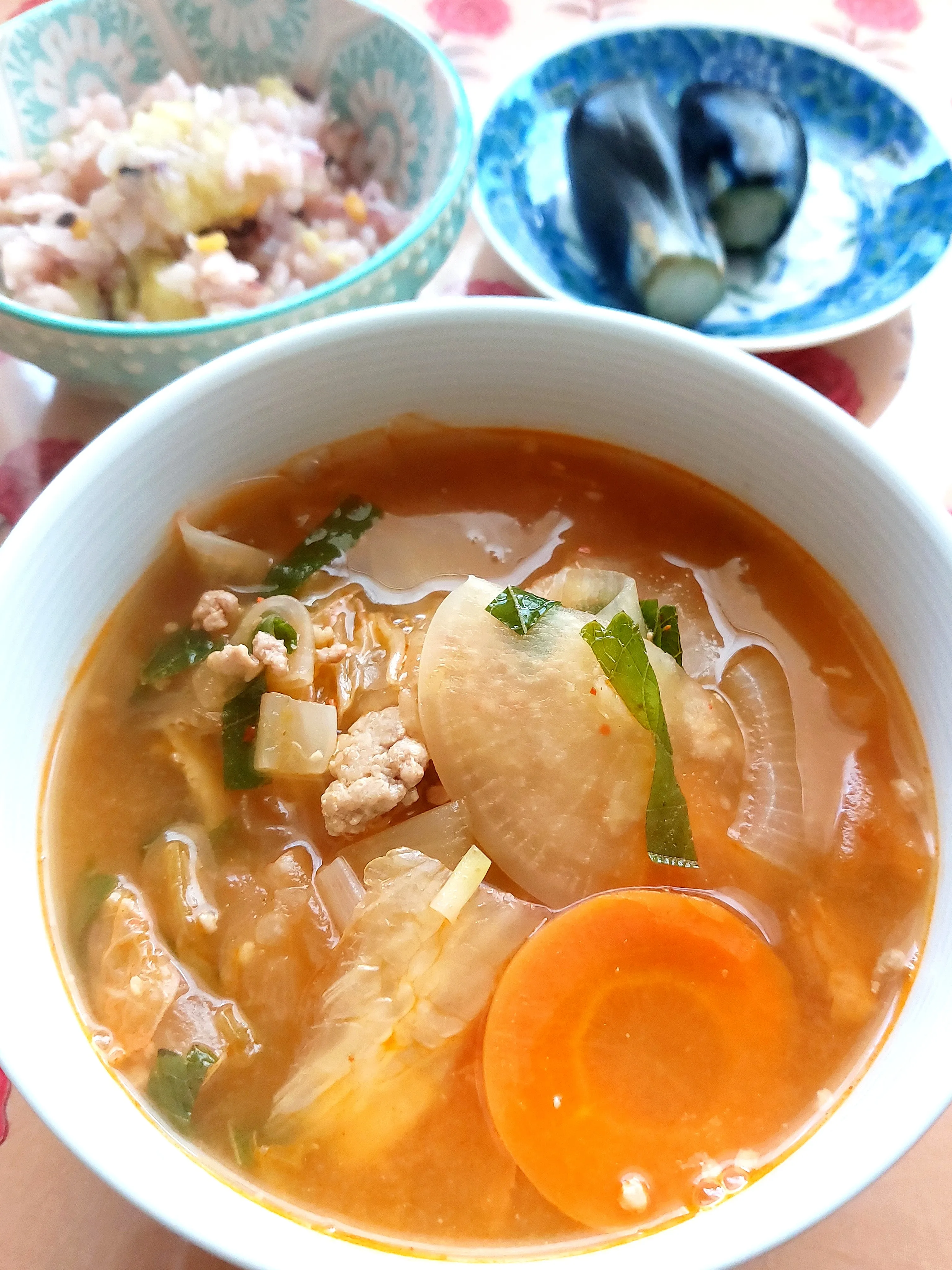 #キムチスープ #茄子漬け #さつまいもごはん #雑穀米