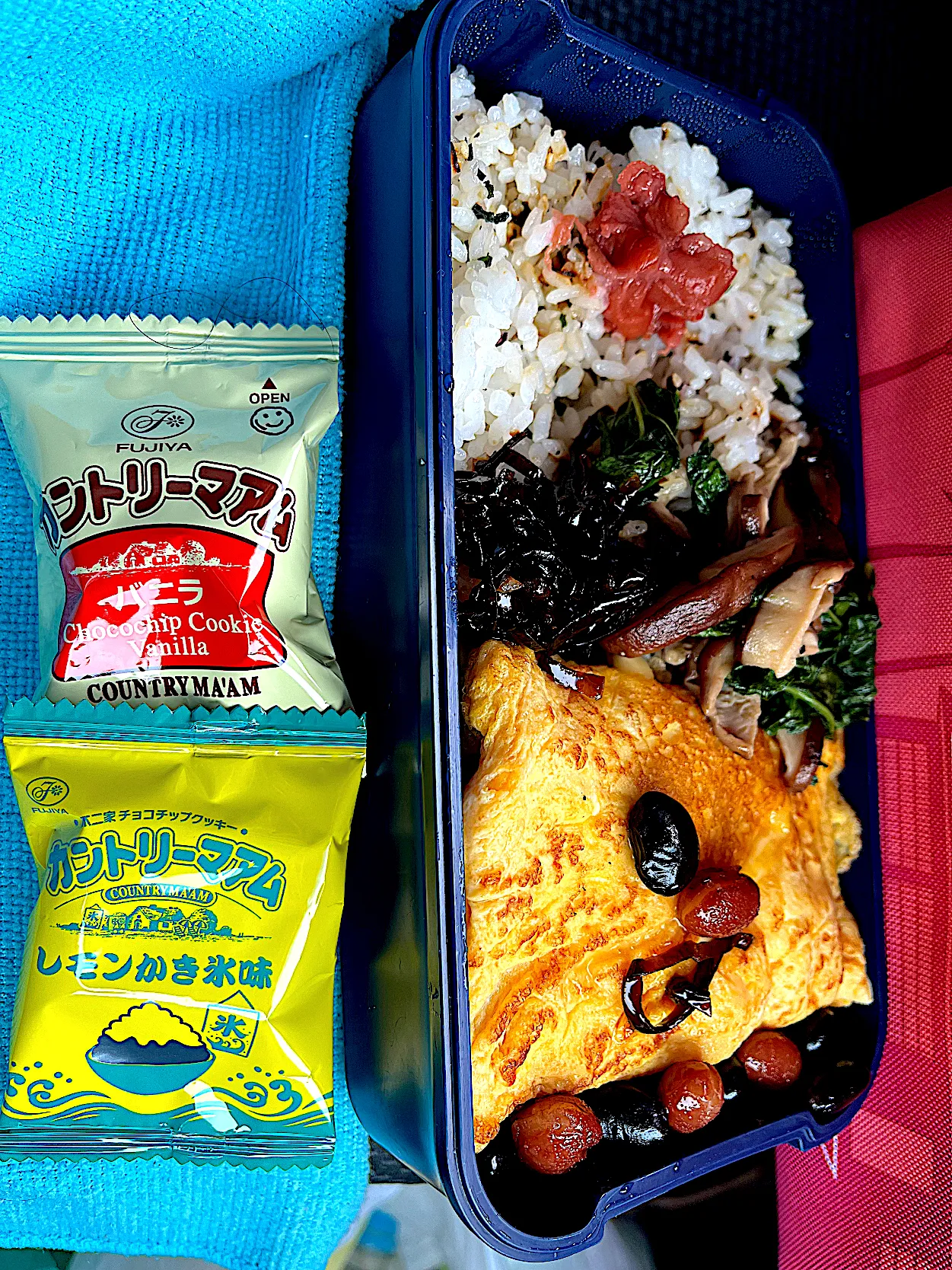 #昼飯 豆と山椒昆布の天パーオッドアイ顔チーズオムレツと梅と黒豆5個茶豆3個乗せ混ぜご飯カントリーマアム2種類添え弁当
