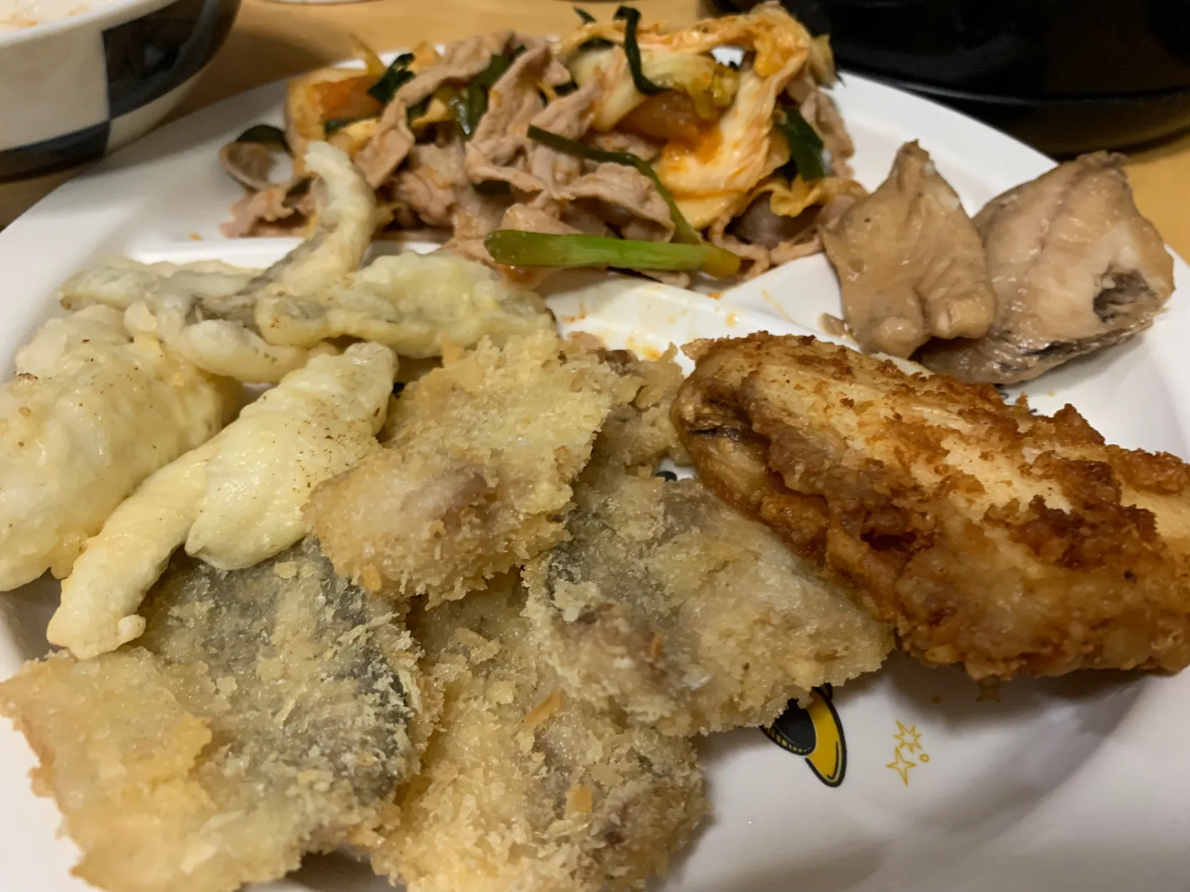 冷凍してたアジ、カワハギ、キスの天ぷら。あと手作りキムチ炒め。辛すぎたのでマヨで誤魔化しながら食べましたー😅