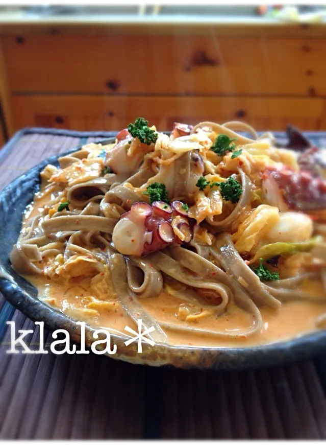 パスタは、おりぃちゃんにもらった蕎麦パスタで😋