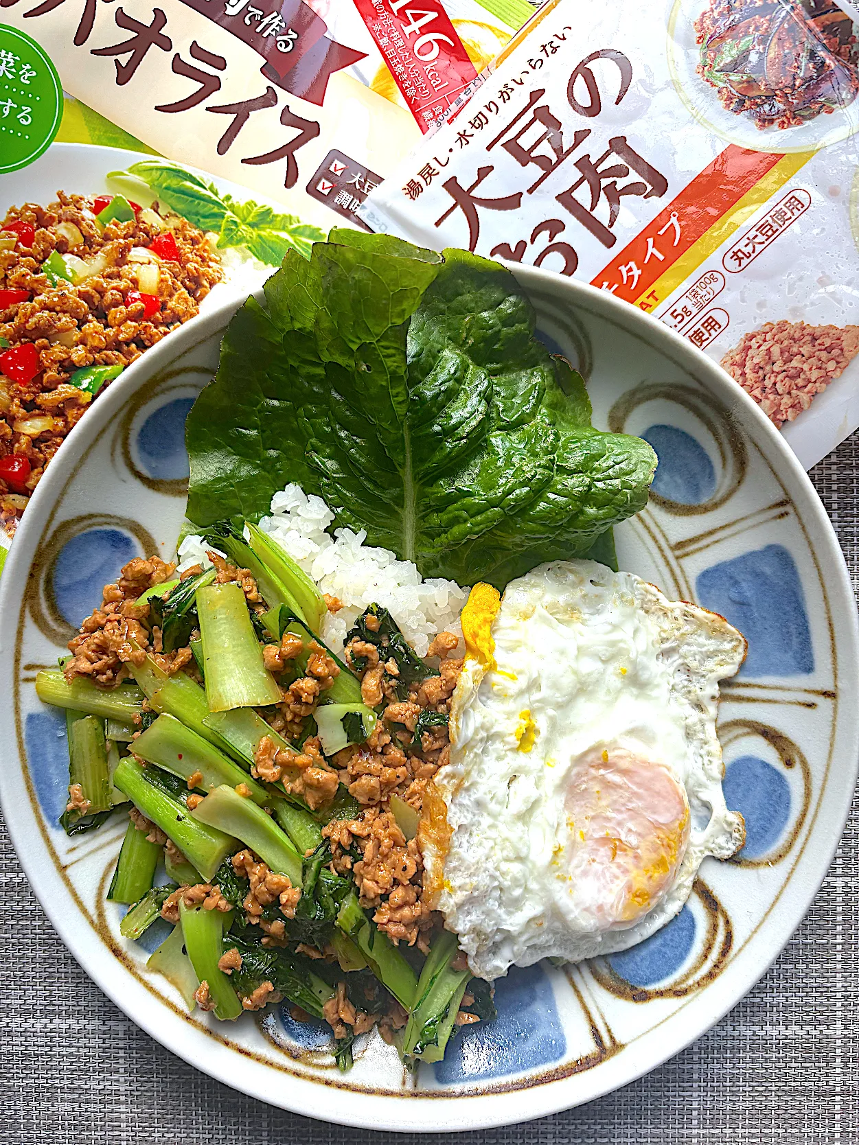 まるで肉のように仕上がる大豆のお肉で塌菜と合わせてヘルシーガパオライスに!大豆のお肉にはしっかり味付けがお勧め。