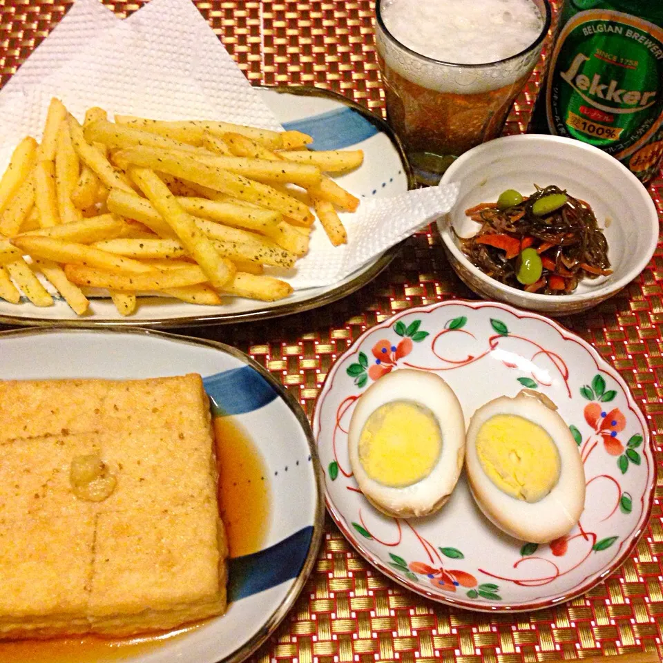 昨日のアヒージョのオイルでガーリックポテト、絹あげ、御節の味見の煮玉子と数の子抜き松前漬け!で乾杯!! #showchu