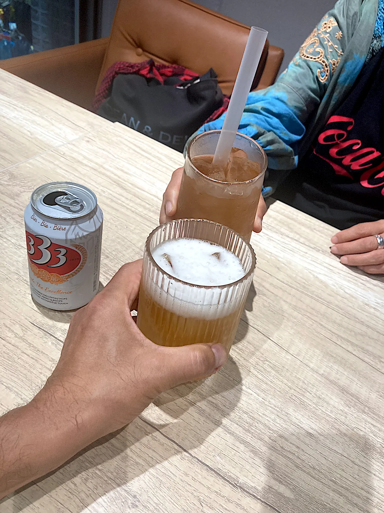 333(バーバーバー)ビールとパッションフルーツティーでかんぱーい( ^ ^ )/□( ^ ^ )/■ ちなみにビールのグラスには氷が入っています。ビールをロックで飲むのがベトナム風?(実況中継中)