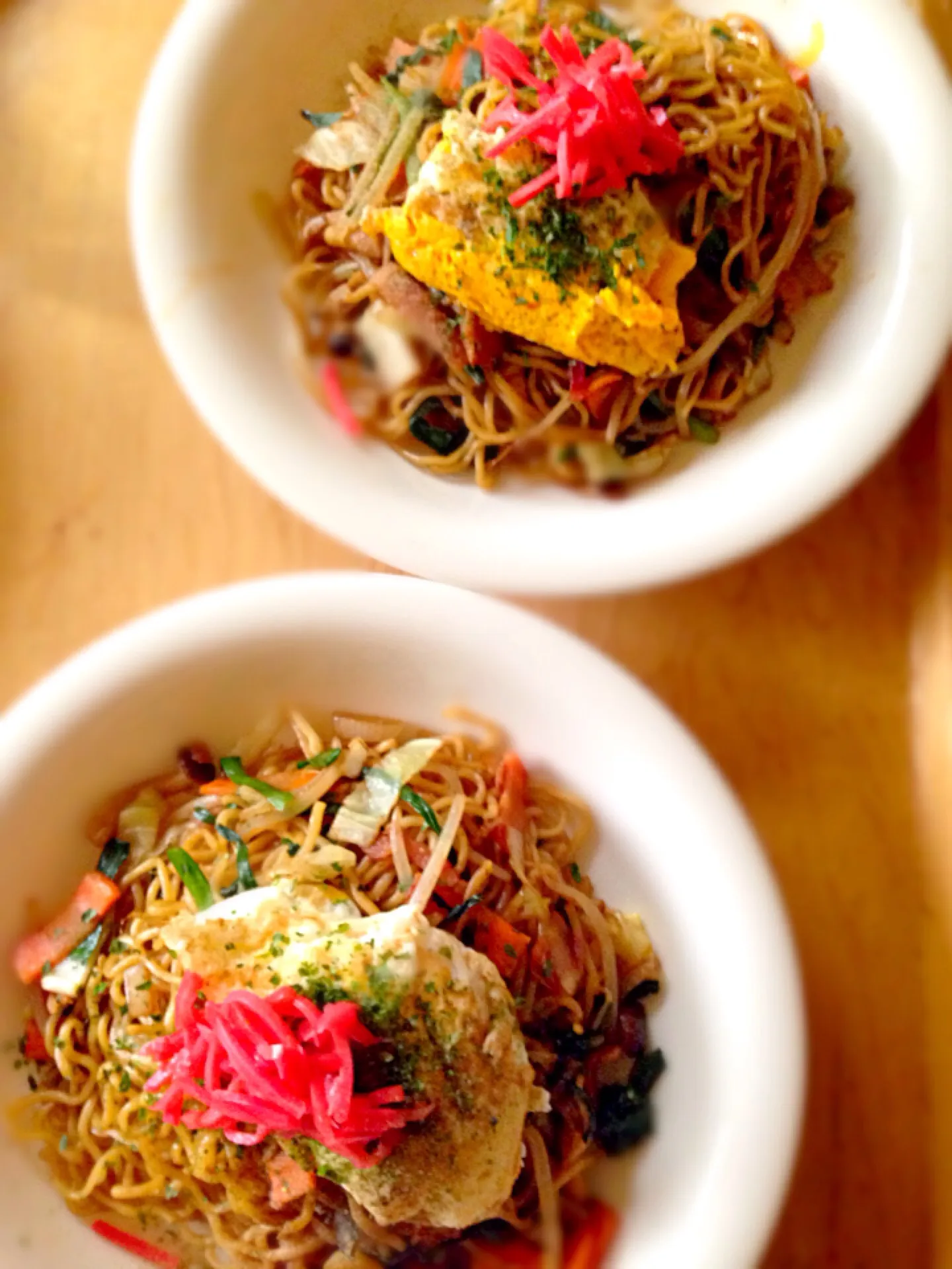 紅生姜たっぷりとお包み卵乗っけでソース焼きそば