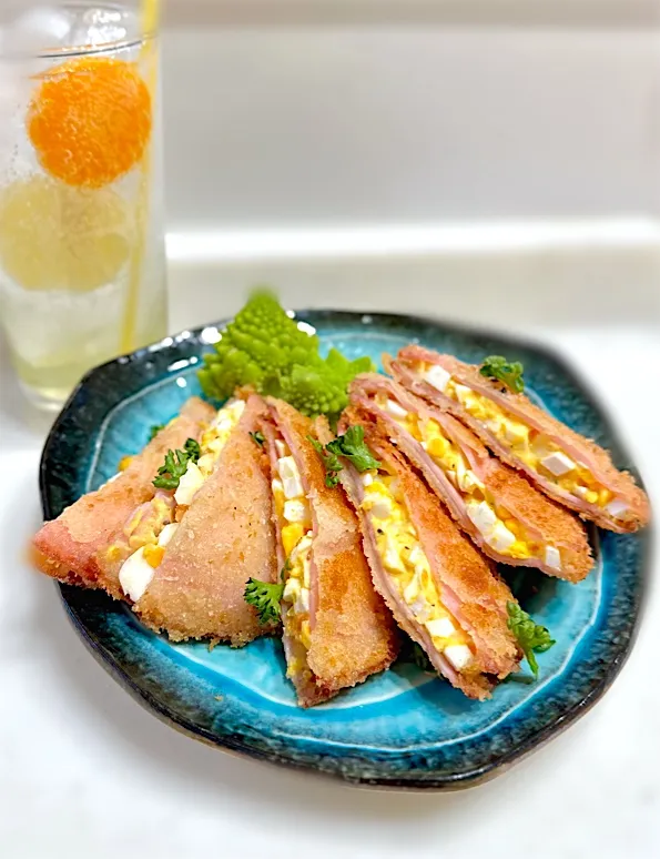 荒目に潰した玉子サラダ(ゆで卵+マヨネーズ)をロースハムで挟んで衣つけて揚げ焼き⤴️