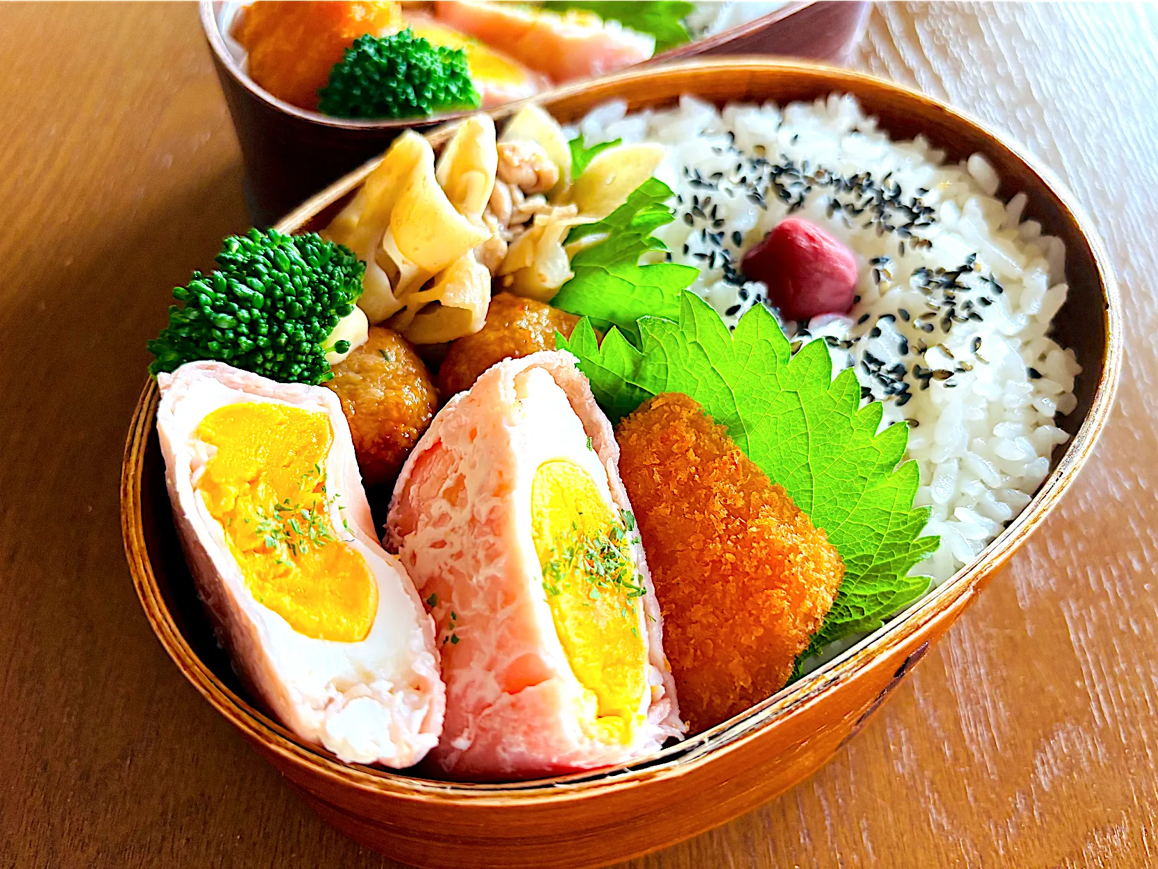 #ハムエッグ #雪若丸 #自家製梅干し #お弁当 #わっぱ弁当 #曲げわっぱ弁当箱 #曲げわっぱ #きんぴらレンコン #つくおき