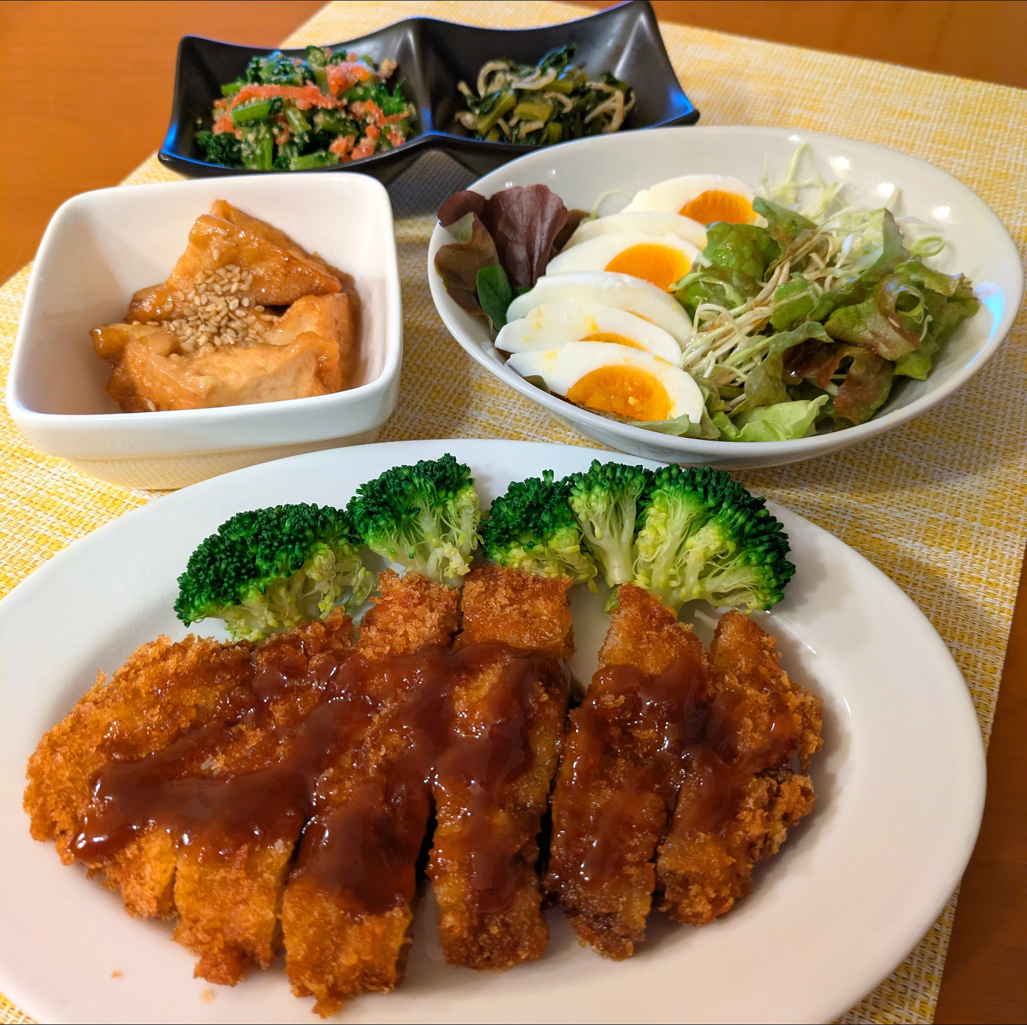 #夕食#トンカツ#サラダ#厚揚げ甘辛焼き#大根葉ごま和え#大根葉とちりめんじゃこ炒め煮