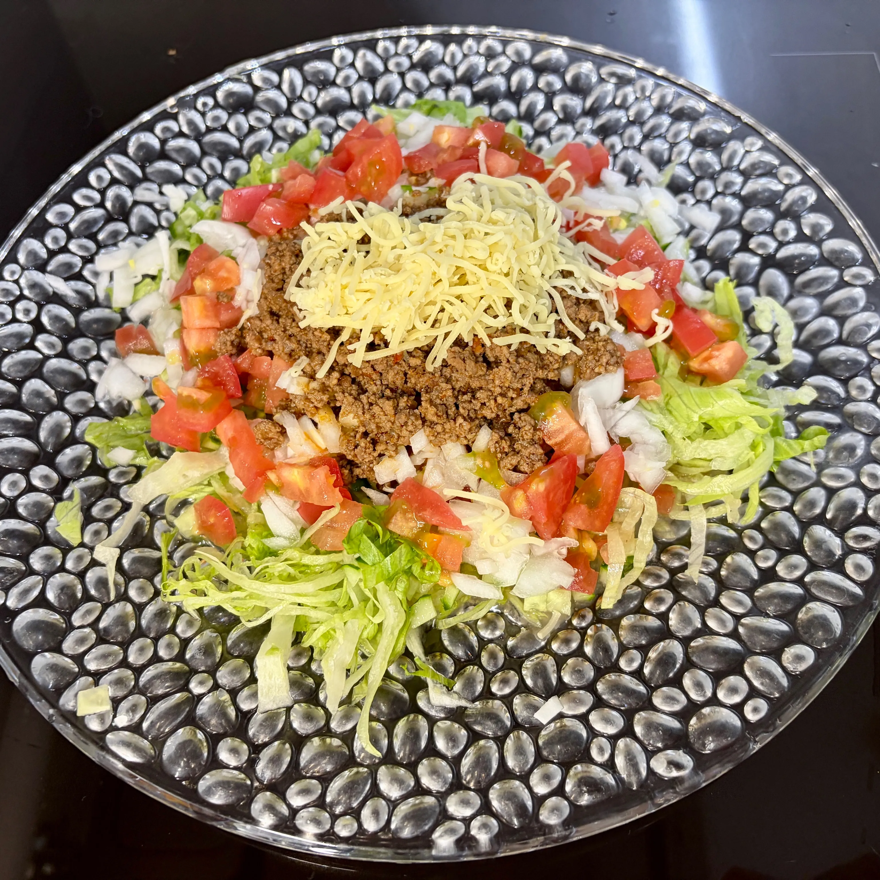 んで、今日は昼にプチ贅沢ランチしたので、夕飯は残り物処理でタコスの具材を皿に乗せてタコサラダ🥗と名付けたものを食べたのでした。