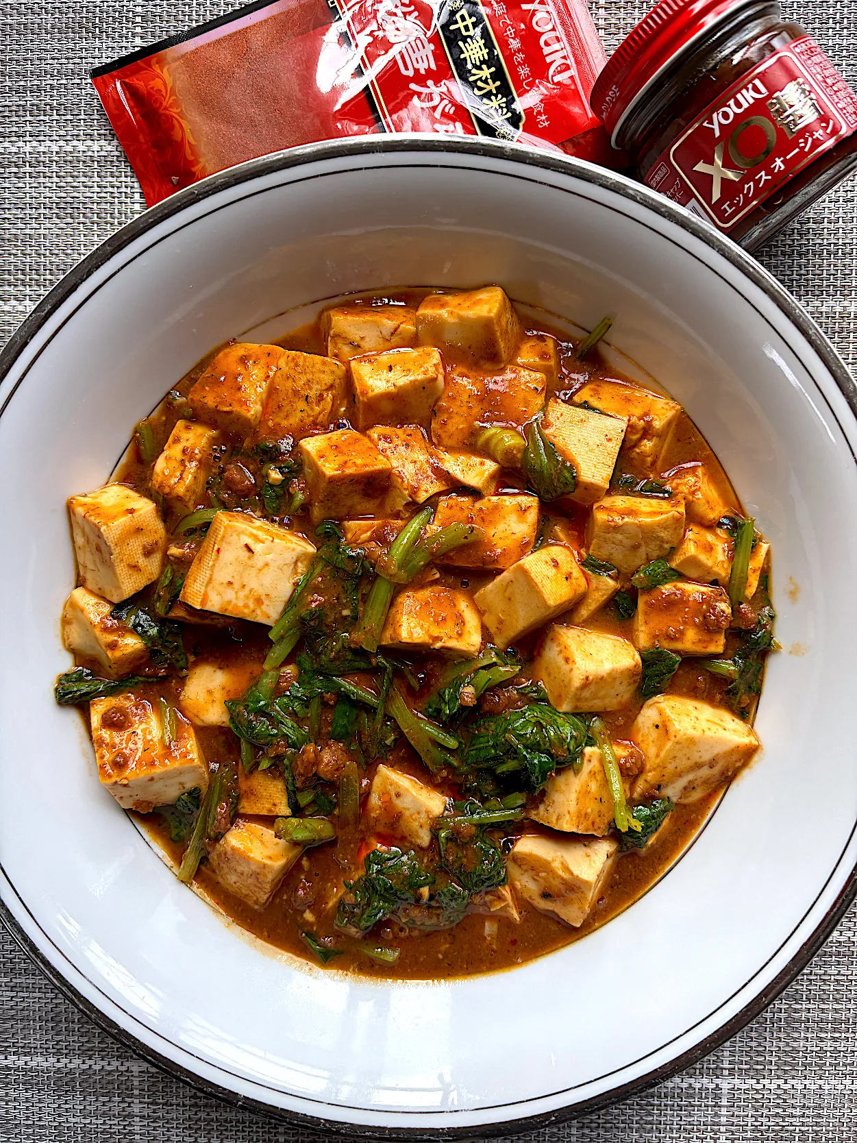 XO醬の香りのほうれんのたっぷり入った麻婆豆腐でご飯!