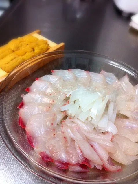 今夜のお刺身🎵御用達の魚屋から、活きものをさばいてもらいました(*^^*)ウニも半額〜😁