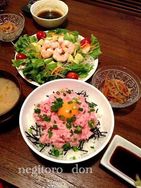 ネギトロ丼、アボガドと海老のサラダ、れんこんのきんぴら、大根味噌汁