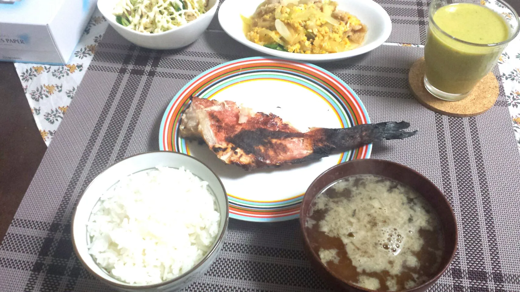 赤魚粕漬け焼き、キャベツとツナのサラダ、海老と豚肉の中華玉子炒め、カジメのお味噌汁~♪