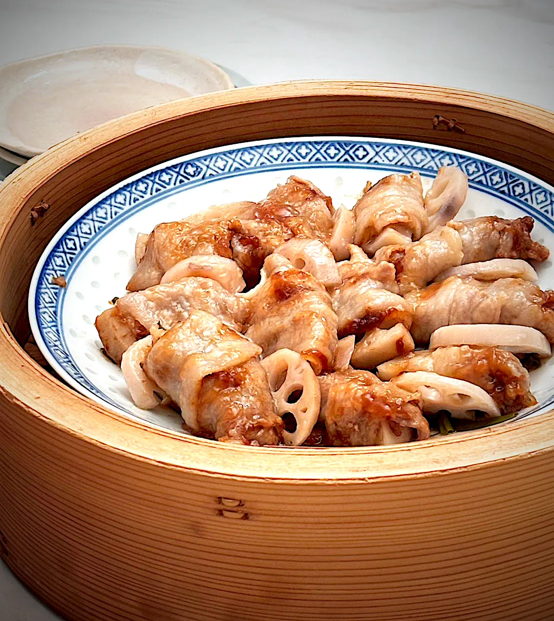 下味をつけた豚肉でれんこんを巻いて・・・蒸すだけ。