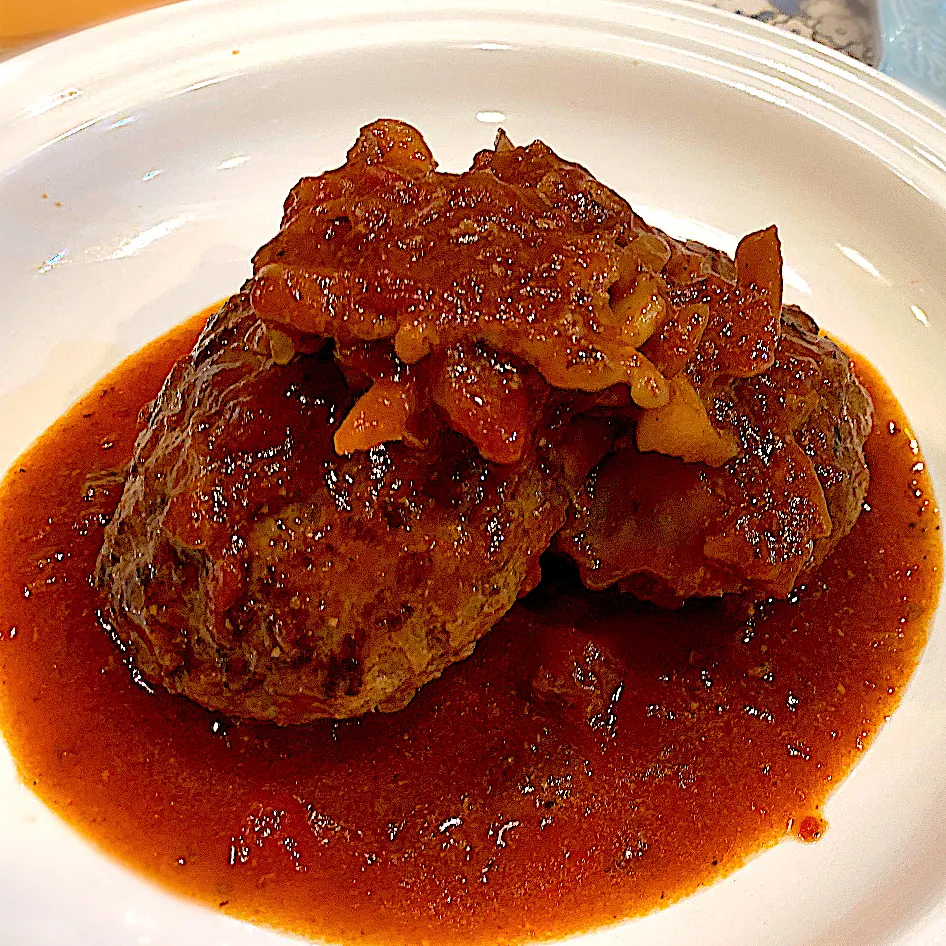 ハンバーグを焼いているフライパンに、ニンニク、玉ねぎ、しめじ、塩麹、野菜ブイヨンパウダー、酒、塩等で作ったパスタソースの余りと、バター、ケチャップ、中濃ソース、水少々入れたと思います☺️