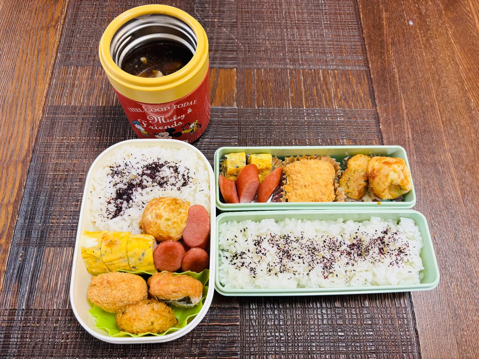 タルタル白身フライ、ウィンナー、ハムイン卵焼き、海苔巻きチキン、生姜のコロコロ、ゆかりご飯、肉汁うどん。