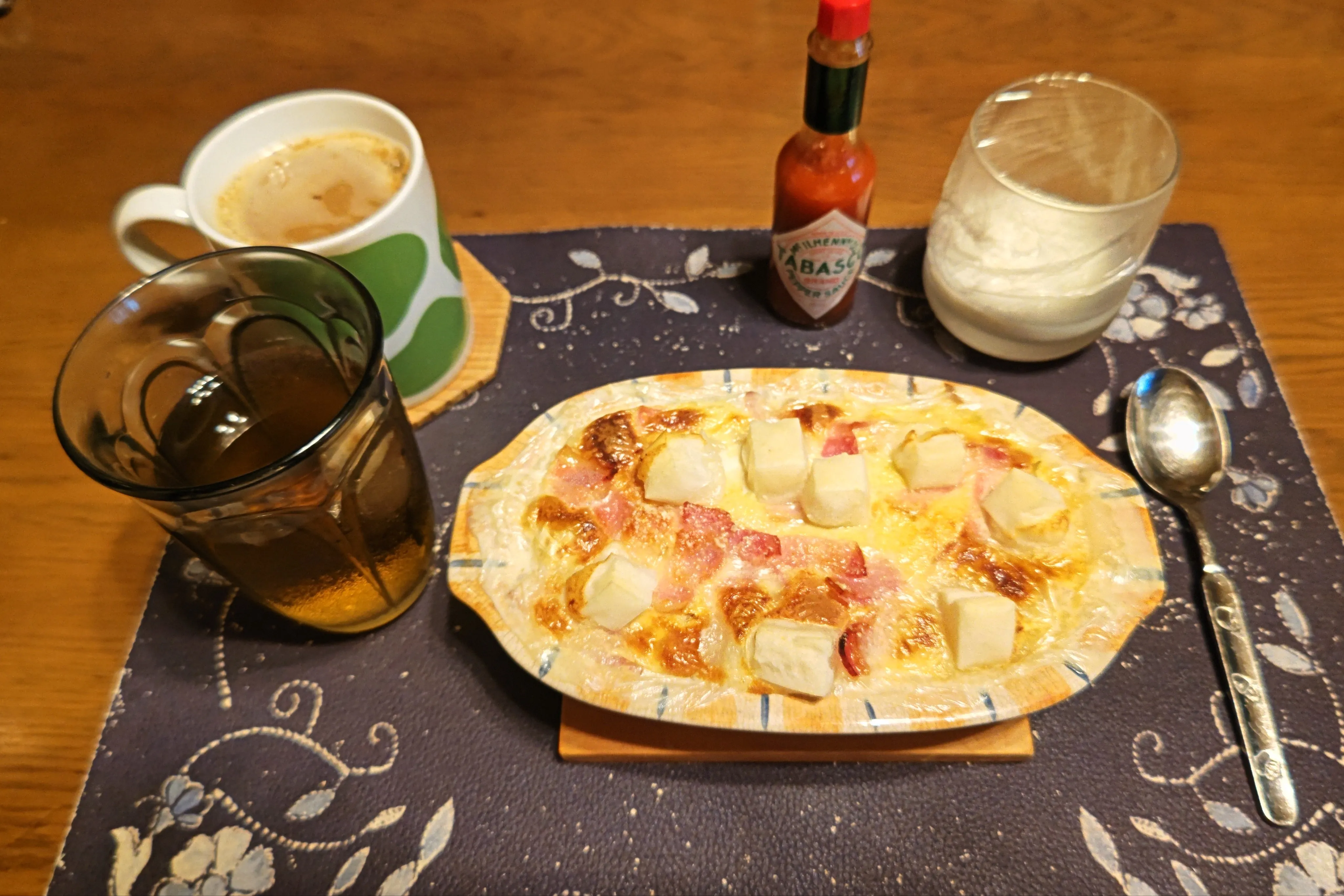 🌟グラタン皿にクイックオーツ50g,牛乳230g,Yummy!万能クッキングたれ・コリアンホット10g→混ぜてラップし600W2分レンチンし混ぜて、千切りキャベツ,シュレッドチーズ,ちぎったスライスチーズ,細切りベーコン,粉チーズ,切り餅→オーブンで210℃20分焼き,辛味香辛料
