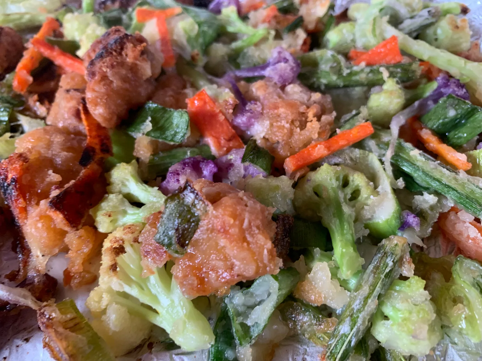 カリフローレ、ねぎ、にんじん、にんじんの葉、なんこつ唐揚げ、小麦粉、片栗粉、サラダ油。