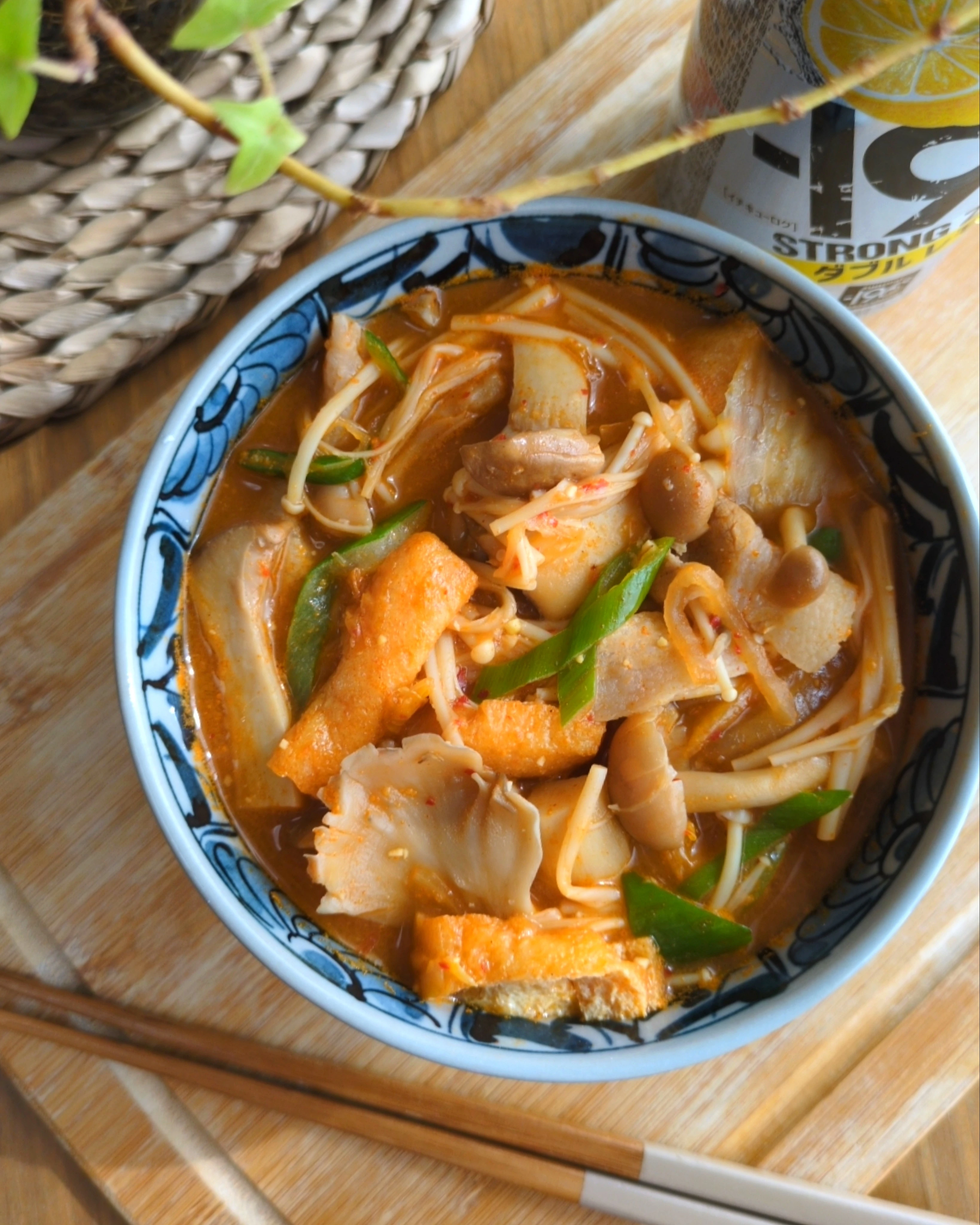 これは速攻腸に届いて良き頼りが来そうな腸活ヘルシースープ🤩腸にいいだけでなく、複数のきのこのうまみに、キムチの刺激、そして、味噌のコク、まろやかさを演出する豆乳で、味も最高に美味そう(๑´ロ`๑)💕