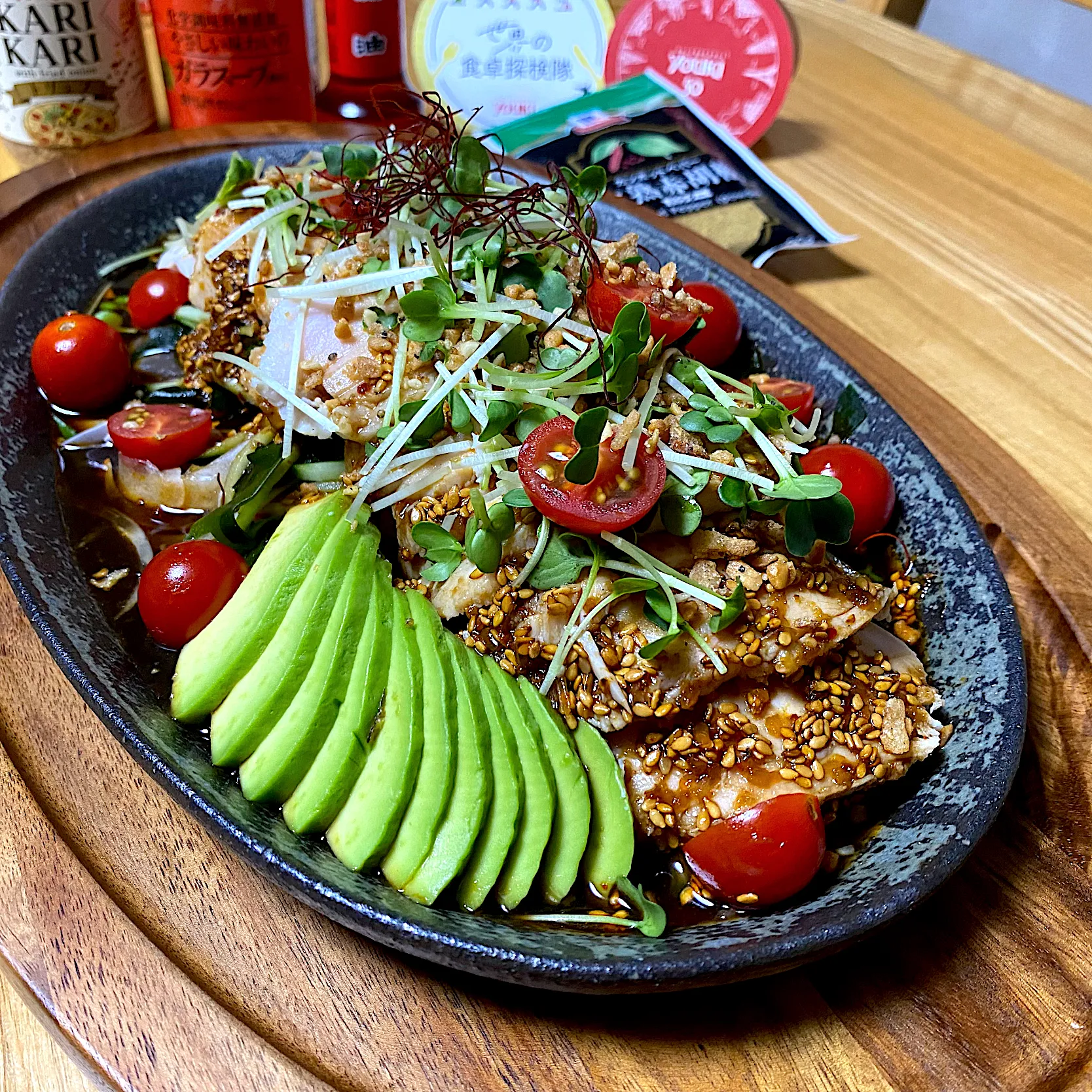 野菜も色んな種類を沢山食べられるよう、スライスオニオン、胡瓜、ワカメ、トマト、ちょうど熟したアボカド、貝割れ大根😁