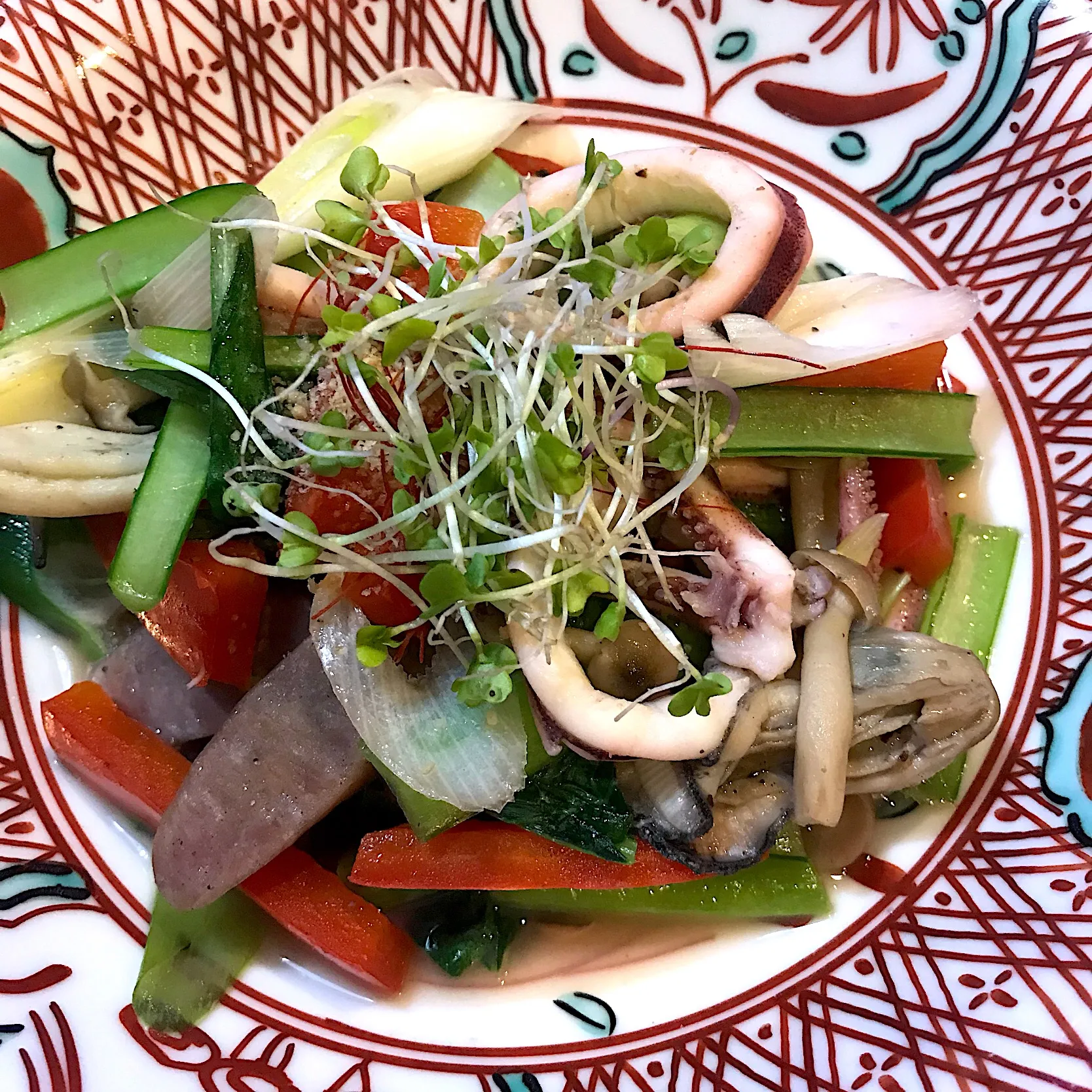 イカ、牡蠣の海鮮炒め〜✩°。⋆⸜(* ॑꒳ ॑* )⸝