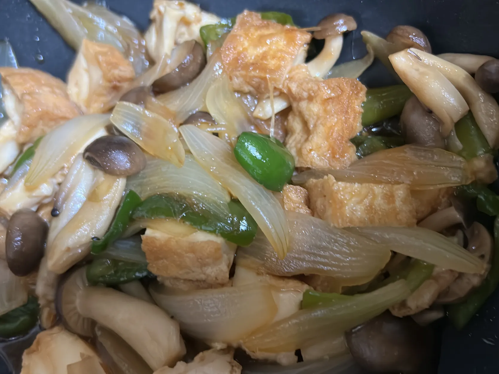厚揚げとブナシメジ、タマネギ、ピーマンのオイスターソース炒め。
