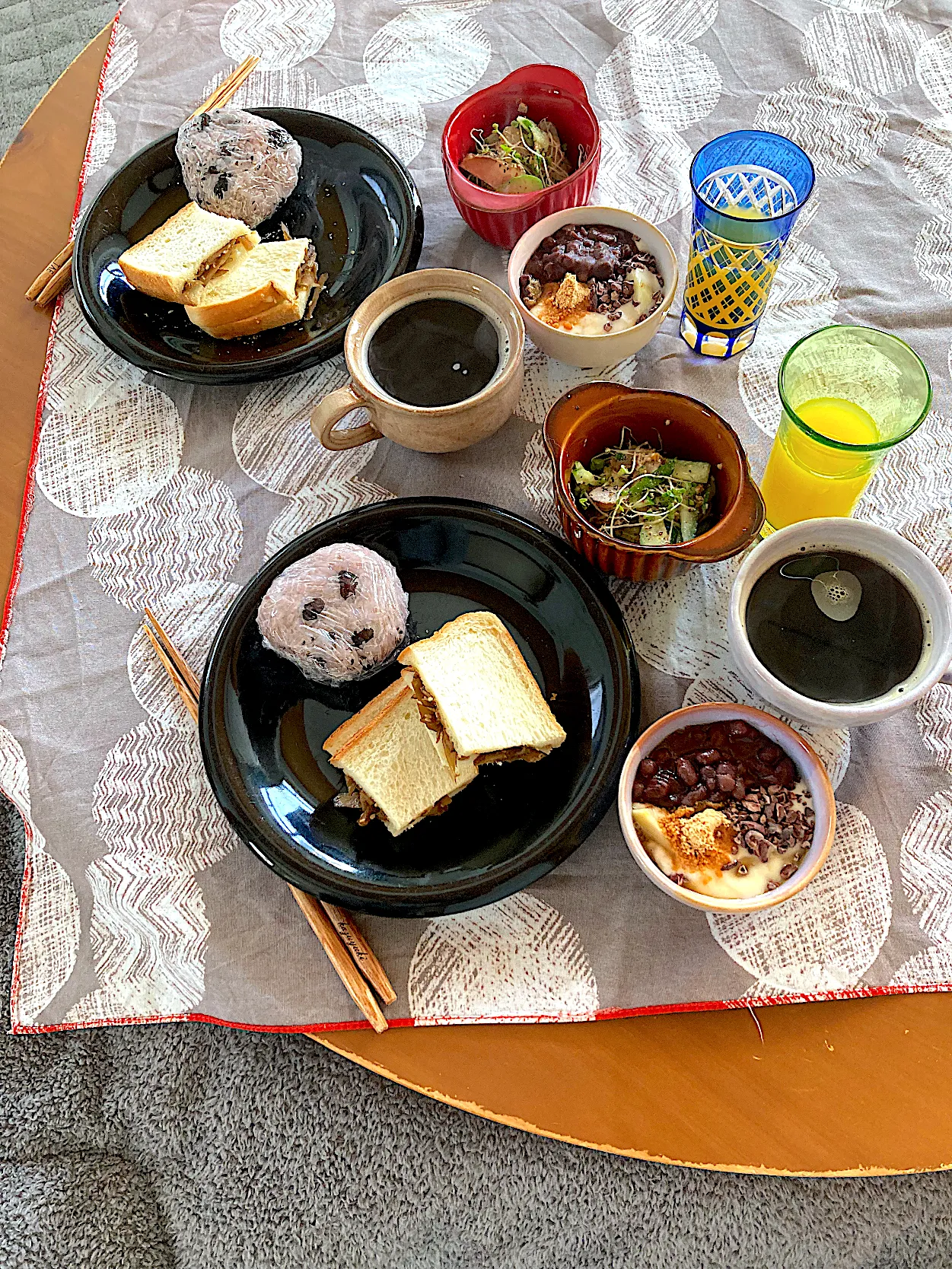 きんぴらごぼうサンド*黒豆ご飯おにぎり*アボカドと菊芋ときゅうりのサラダ*タンポポ珈琲*スイートスプリング生搾りジュース*豆乳グルト(カカオニブ、エルダーフラワーコーディアル、ダークアガベシロップ、乳酸菌きな粉、きび砂糖あんこ)