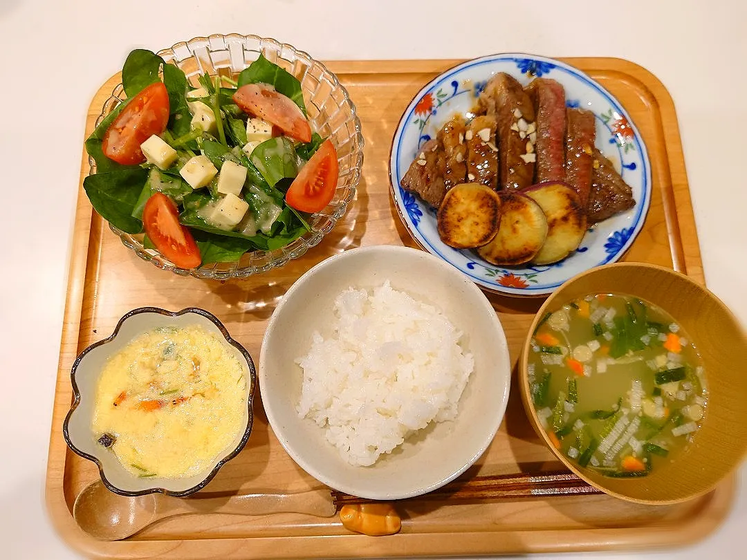 赤身ステーキ、ほうれん草とモッツァレラチーズのサラダ、茶碗蒸し、サツマイモの素焼き、エビと水菜の白湯スープ(無印良品)