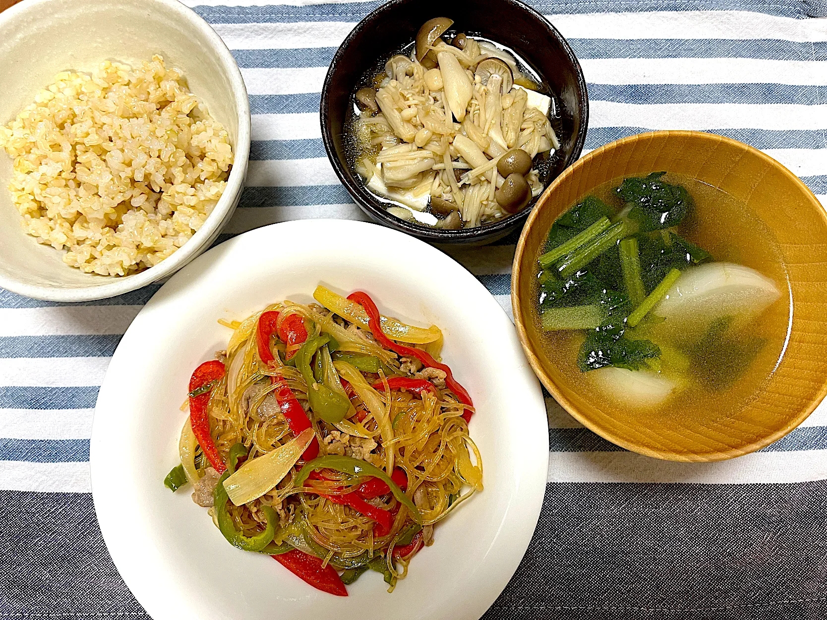 チャプチェ、きのこと豆腐のポン酢レンジ蒸し、蕪の中華スープ
