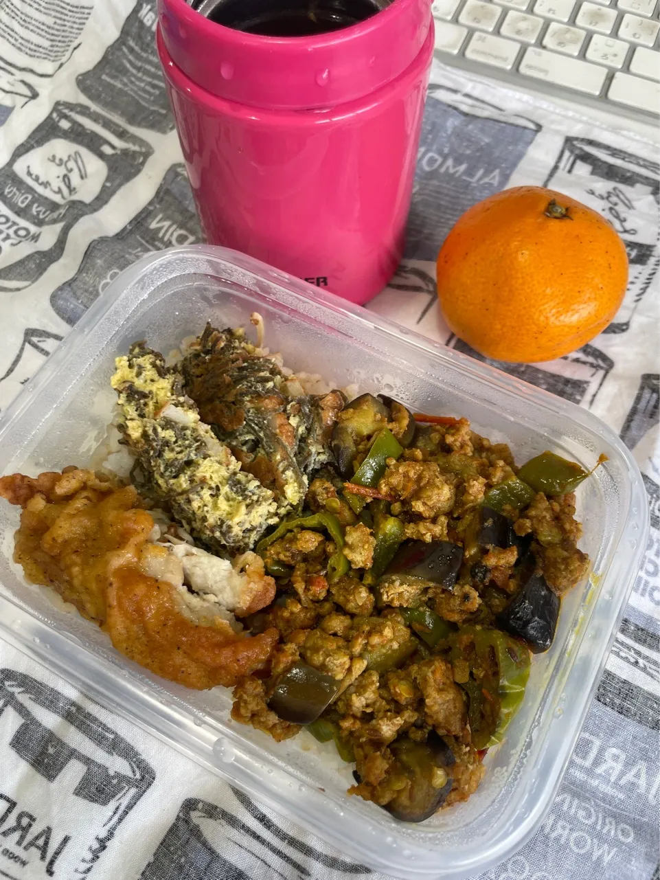 なす、ししとう、豚ひき肉のキーマカレー、ご飯、もずくちくわ卵焼き、ケンタッキーフライドチキン、スパイスオニオンスープ、みかん