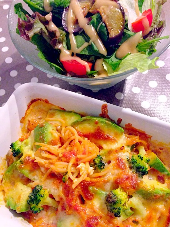 今日は1人ご飯💛昨日の残りのパスタでパスタグラタンにしました😍🍝トマトソースパスタにアボカドもプラス😊🍀作り過ぎたサラダもモリモリ頂きます😍🌿