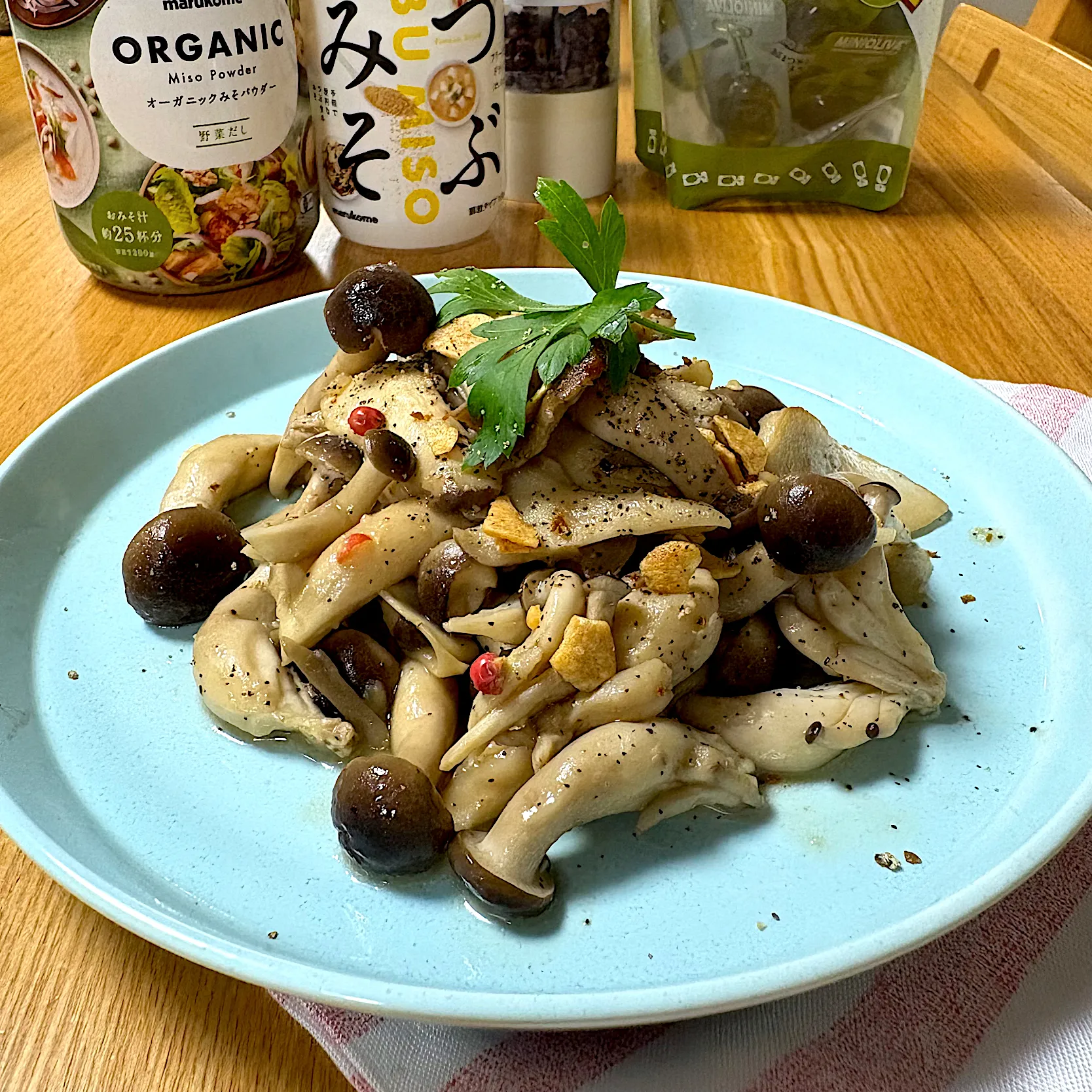 常備菜としてよく作るきのこのマリネ、和食材、粒みそで置き換え。