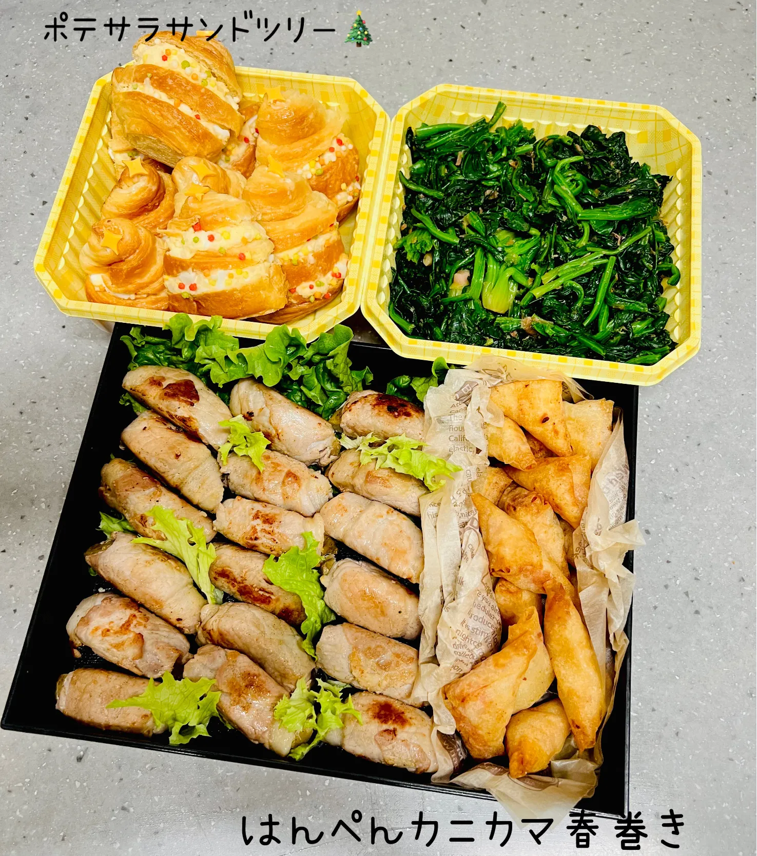 肉巻きポテトにポテサラサンドとかにかま春巻き👏👏👏👏👏