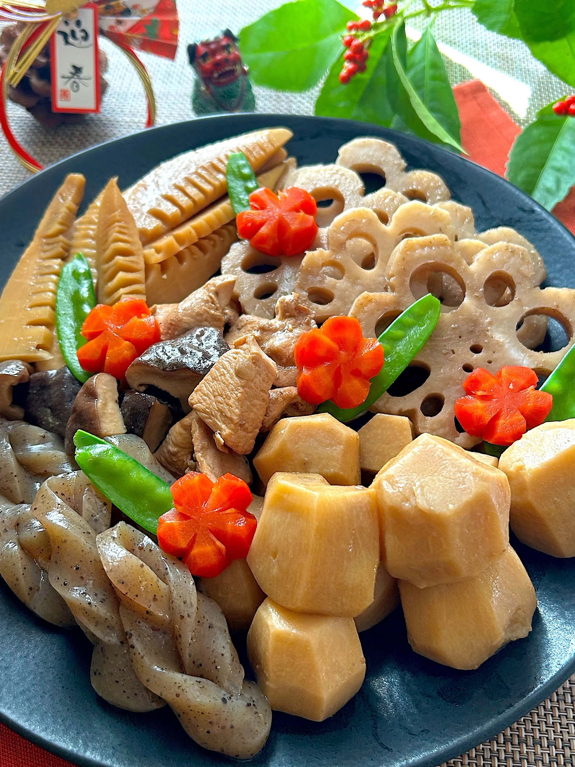 こちらのお煮しめも味がしゅんでる良い色😍一つ一つ丁寧に飾り切りもされてて美しい( ᵒ̴̷͈ωᵒ̴̶̷͈ )✨️