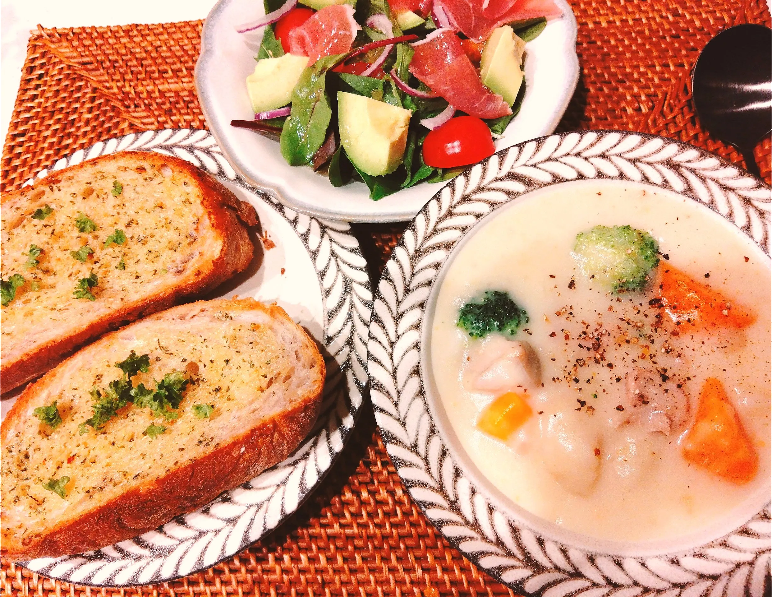 今日は子供たちリクエストでシチューとガーリックトーストに☺️🥖