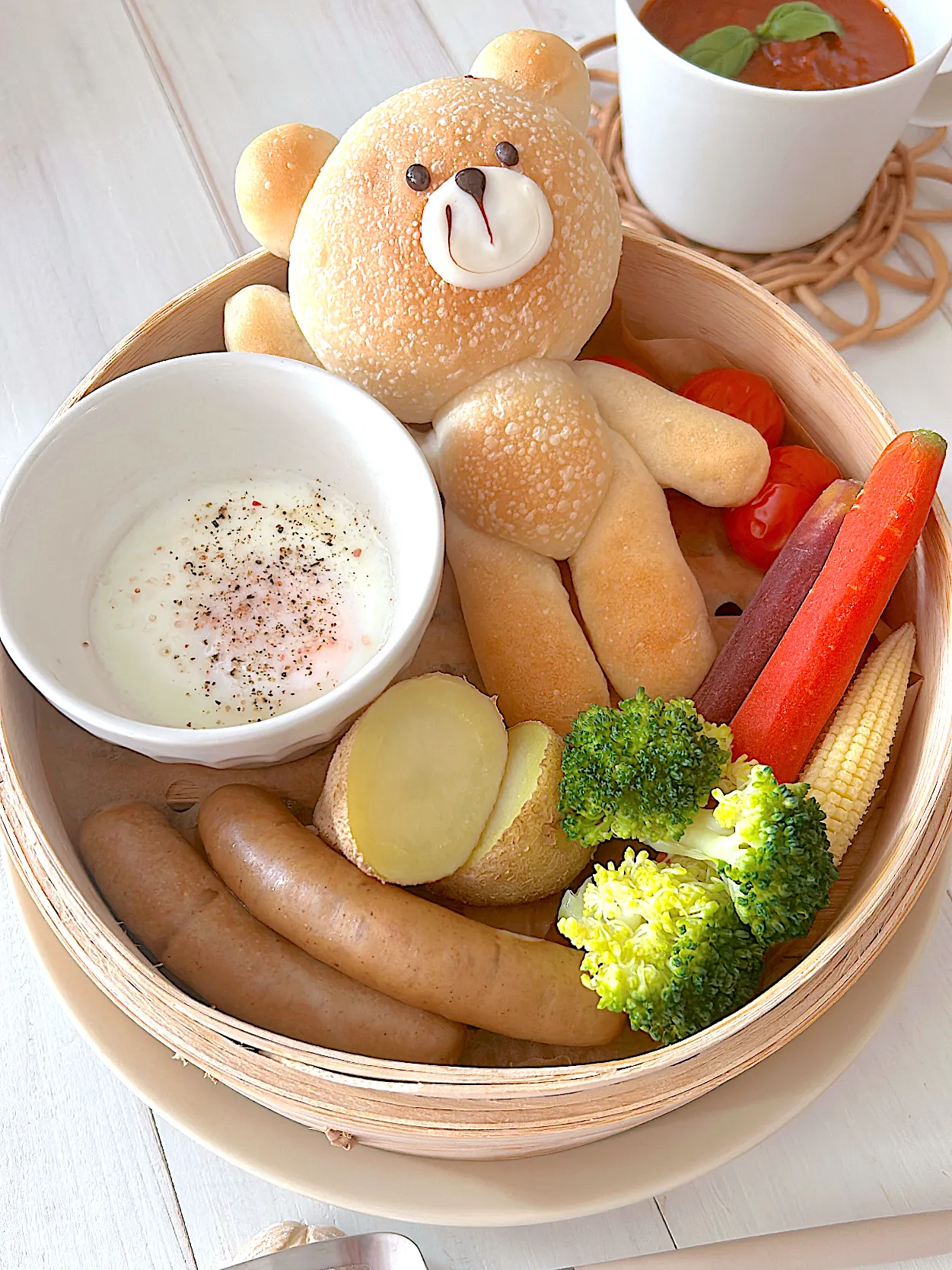 くまパンと一緒に、彩り野菜とソーセージをふんわり蒸して𓈒𓏸𓈒𓇬𓂂