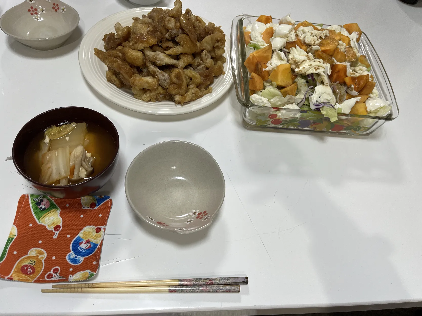 晩御飯☆サラダ(モッツァレラ・柿・サラダミックス)☆鶏皮の甘辛和え☆豆腐と野菜のキムチスープ