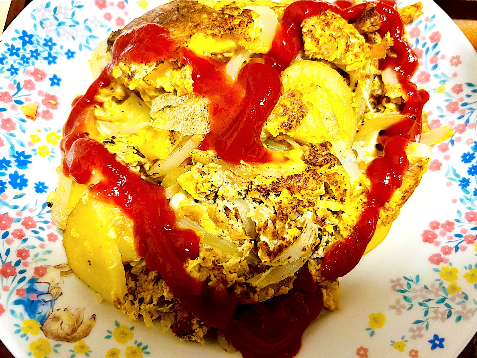 じゃがいもたまねぎたまごと大豆のお肉ミンチでオムレツ