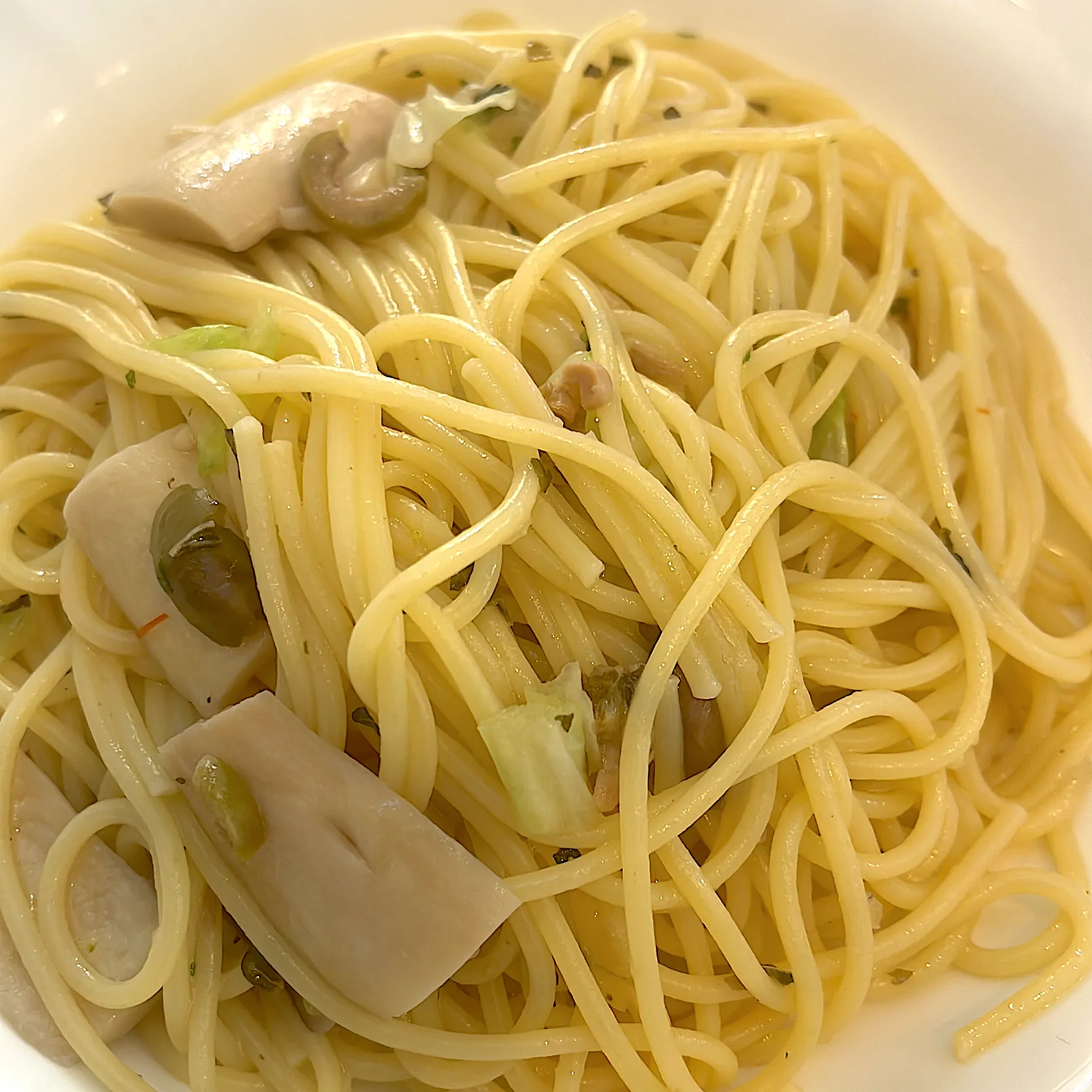 残ったアヒージョスープ、青の洞窟のボンゴレ、アンチョビ、オイル漬けオリーブ、キャベツ、エリンギを、加えた